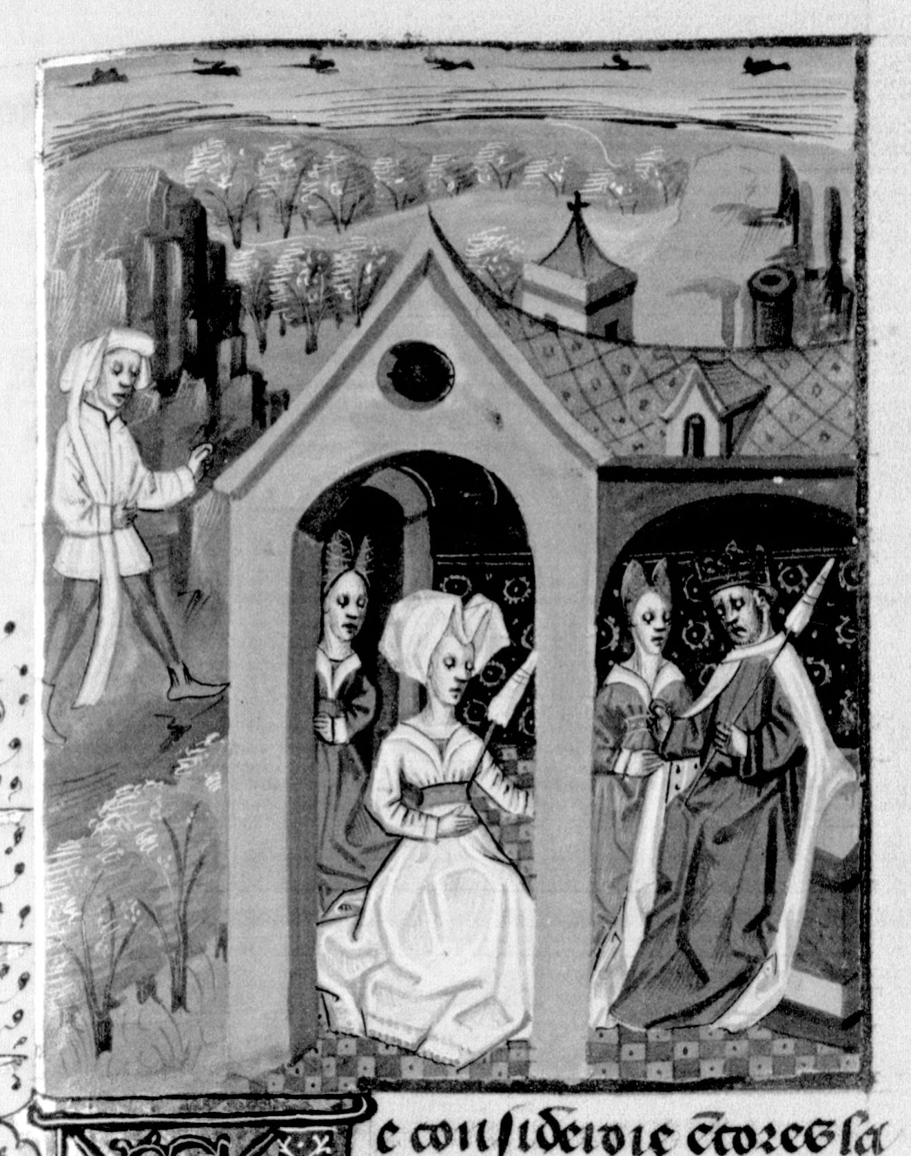 Parigi, Bibliothèque Nationale de France, Fr. 232, f. 49r. Sardanapalo fila con fuso e conocchia insieme alle sue donne.
