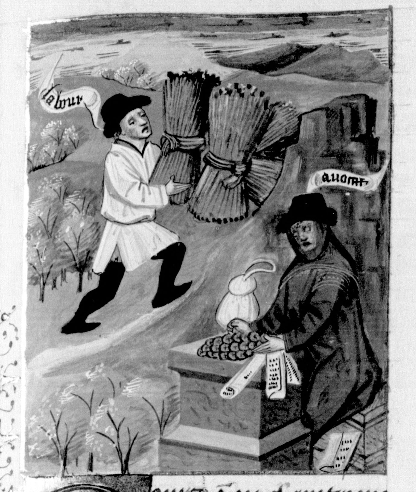 Parigi, Bibliothèque Nationale de France, Fr. 232, f. 102r. Un contadino trasporta dei fasci di grano e un avvocato conta del denaro (rappresentazione della ricerca della felicità materiale).