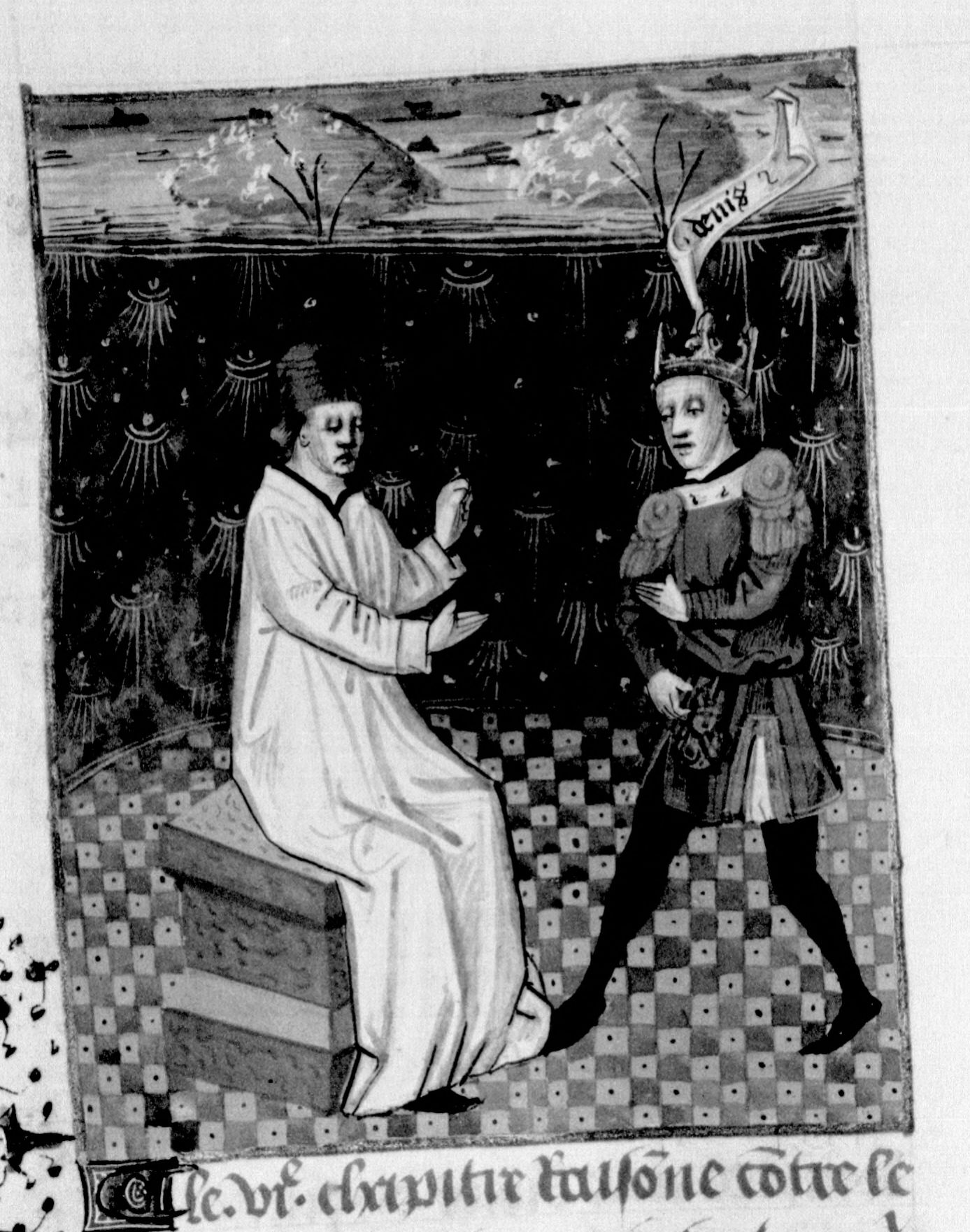 Parigi, Bibliothèque Nationale de France, Fr. 232, f. 119v. L'autore Giovanni Boccaccio conversa con Dionigi di Siracusa.