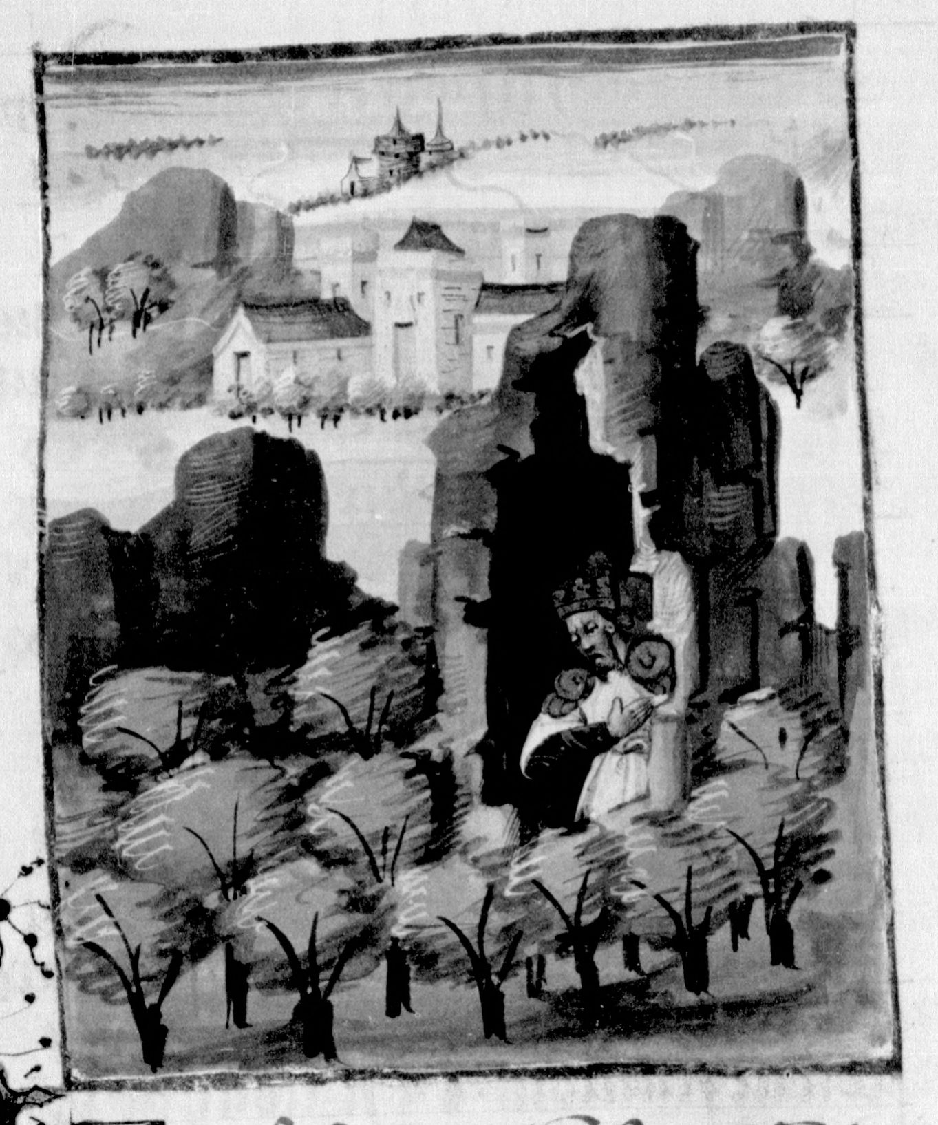 Parigi, Bibliothèque Nationale de France, Fr. 232, f. 166v. Massinissa vive nascosto in una caverna nella foresta.