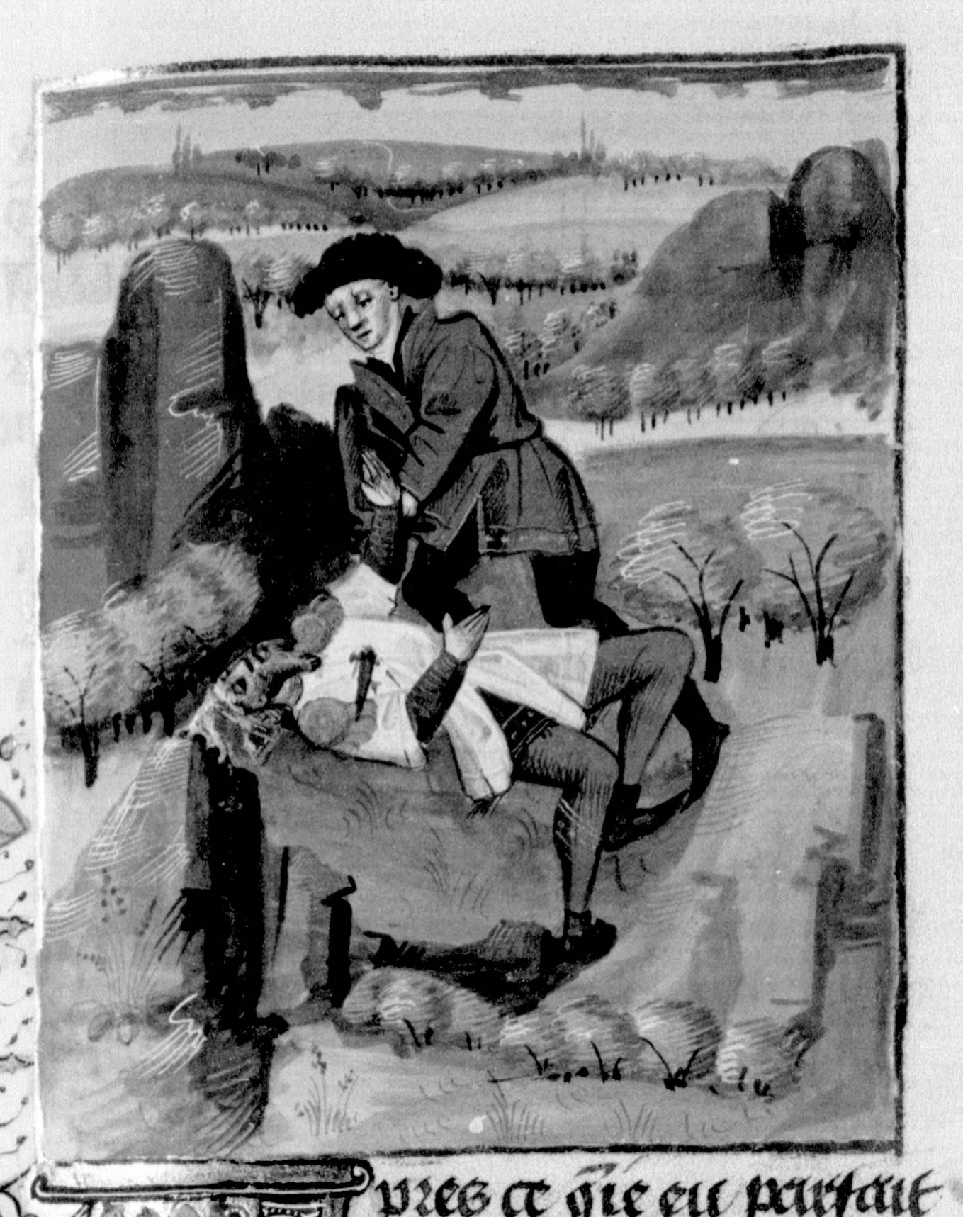 Parigi, Bibliothèque Nationale de France, Fr. 232, f. 168r. Il generale Alessameno uccide Nabide.