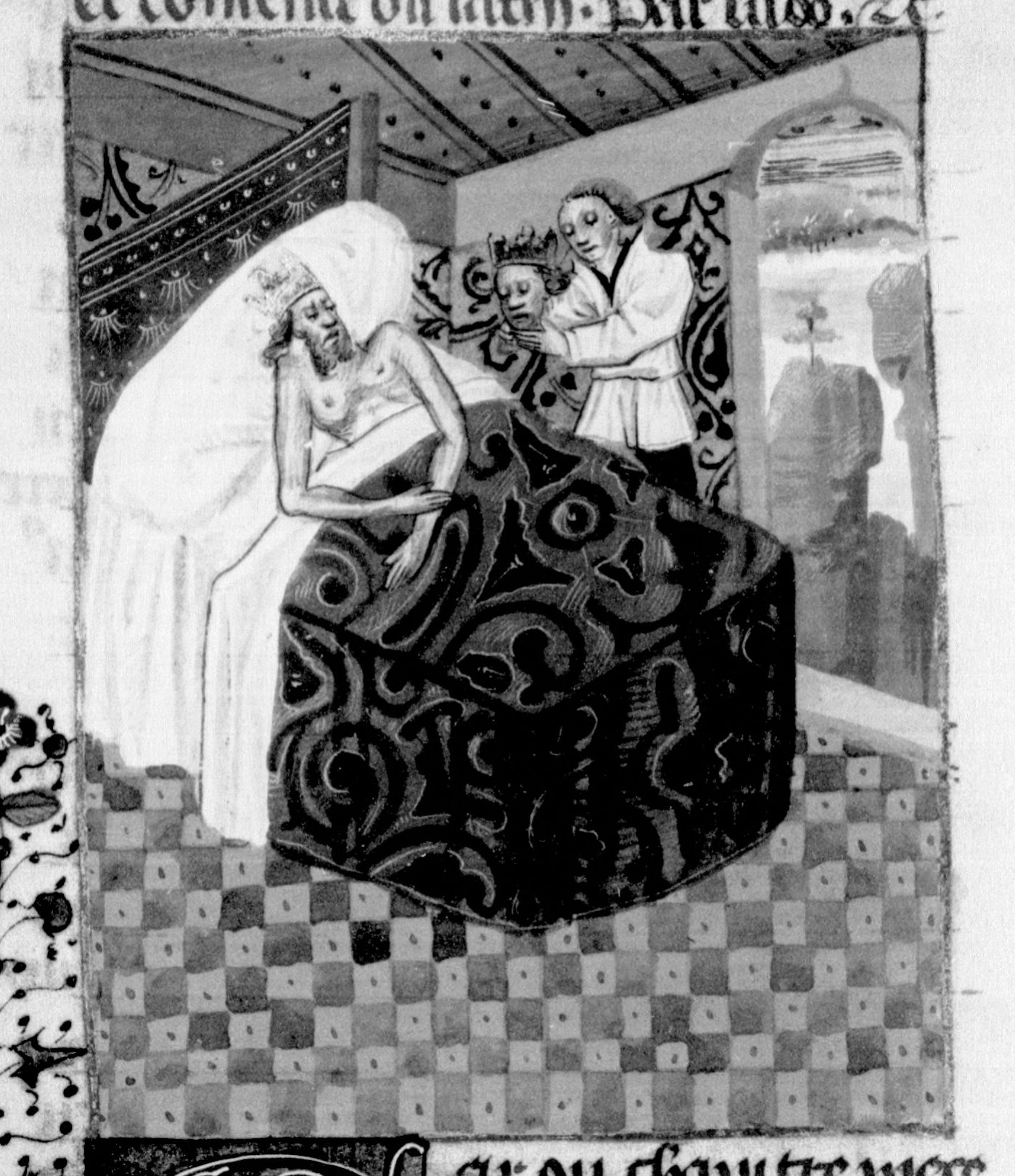 Parigi, Bibliothèque Nationale de France, Fr. 232, f. 184r. Un uomo presenta la testa di Alessandro I Bala a Tolomeo, che giace nel proprio letto.