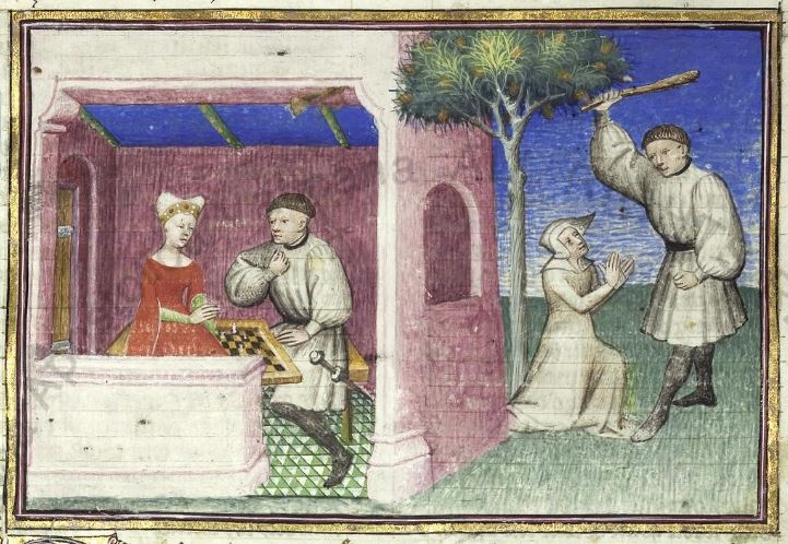 Città del Vaticano, Biblioteca Apostolica Vaticana, Pal. lat. 1989, f. 215r. Il copista del manoscritto, datato 15 giugno 1414, è Laurent de Premierfait. Lodovico gioca a scacchi con Beatrice, lasciandola vincere; Lodovico bastona Egano, il quale è travestito da sua moglie.
