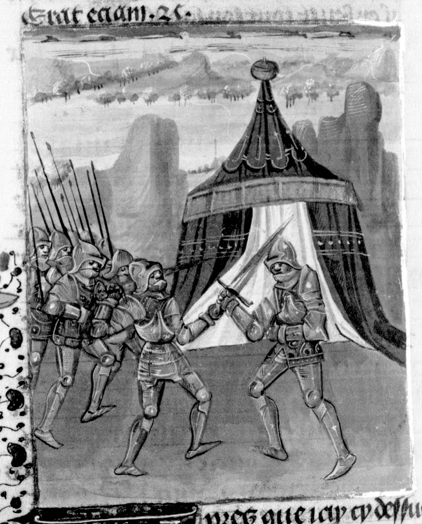 Parigi, Bibliothèque Nationale de France, Fr. 232, f. 213v. Due guerrieri si sfidano a duello in un accampamento.
