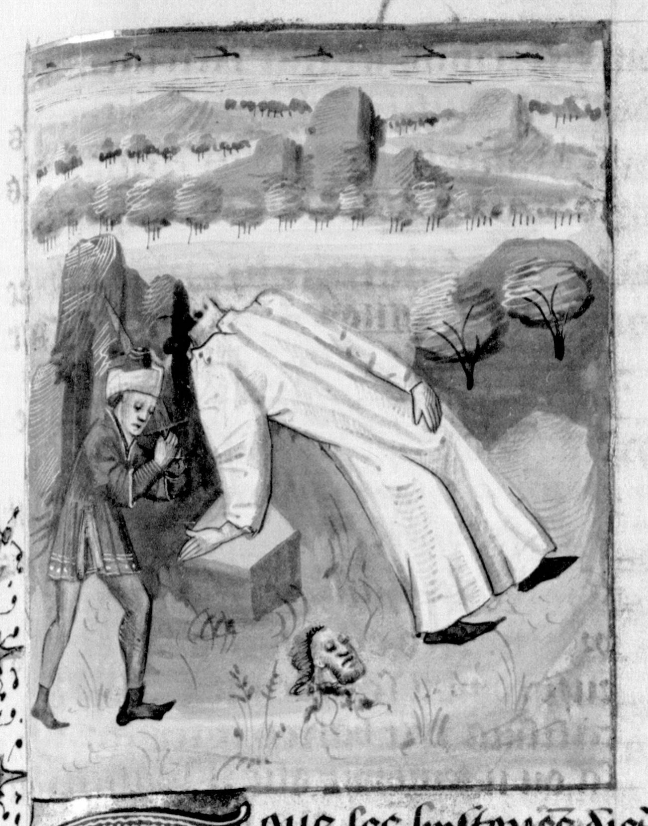 Parigi, Bibliothèque Nationale de France, Fr. 232, f. 227r. Un sicario taglia la mano di Cicerone dopo averlo decapitato.