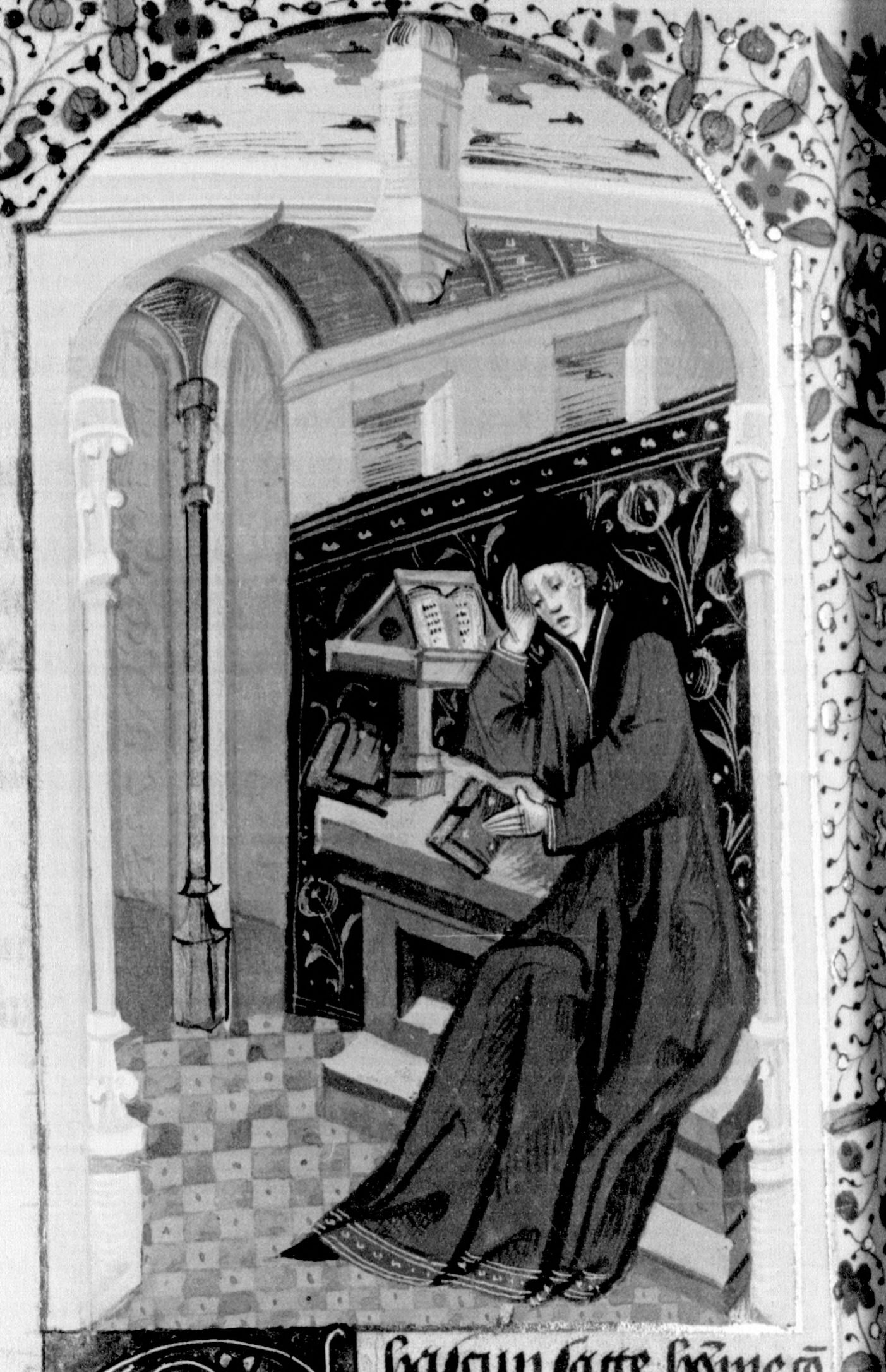 Parigi, Bibliothèque Nationale de France, Fr. 232, f. 237v. L'autore Giovanni Boccaccio siede addormentato al suo scrittoio.