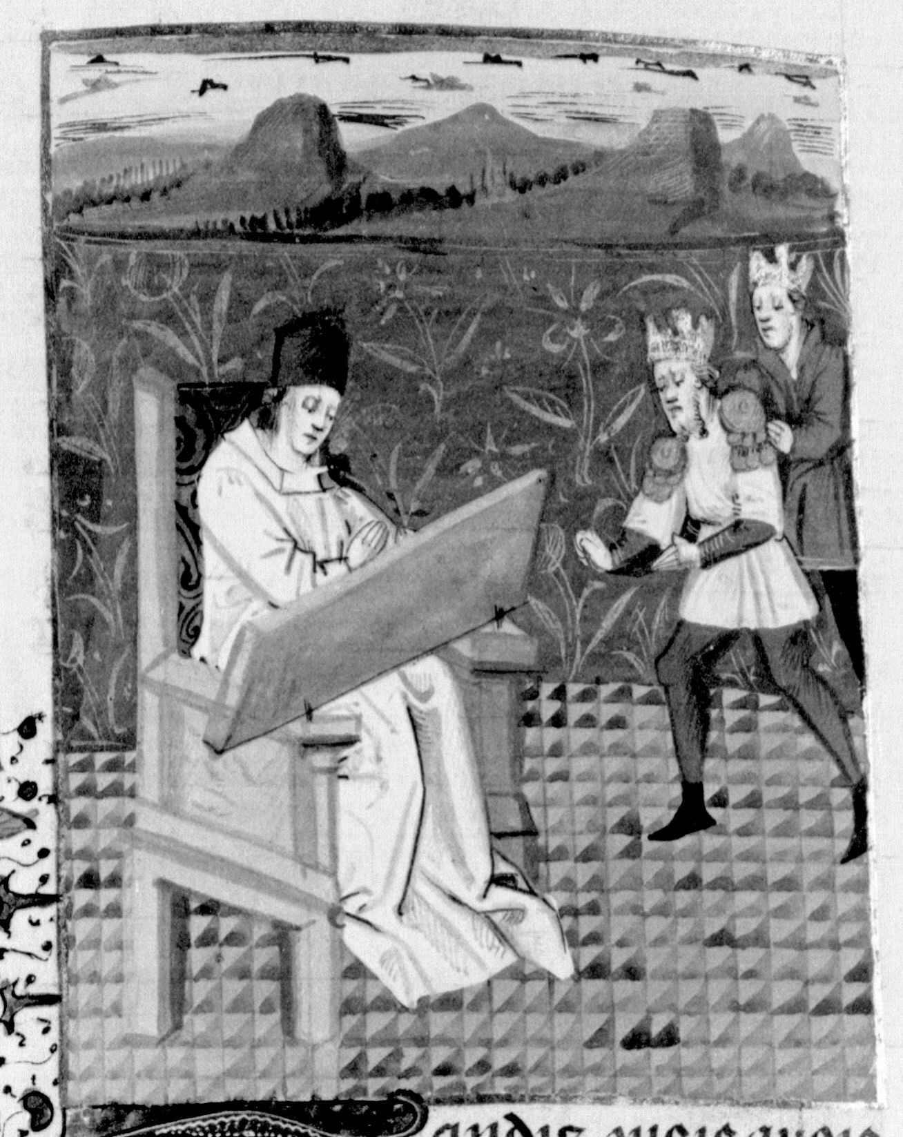 Parigi, Bibliothèque Nationale de France, Fr. 232, f. 298v. Due sovrani si presentano dinanzi a Giovanni Boccaccio, il quale è seduto in cattedra.