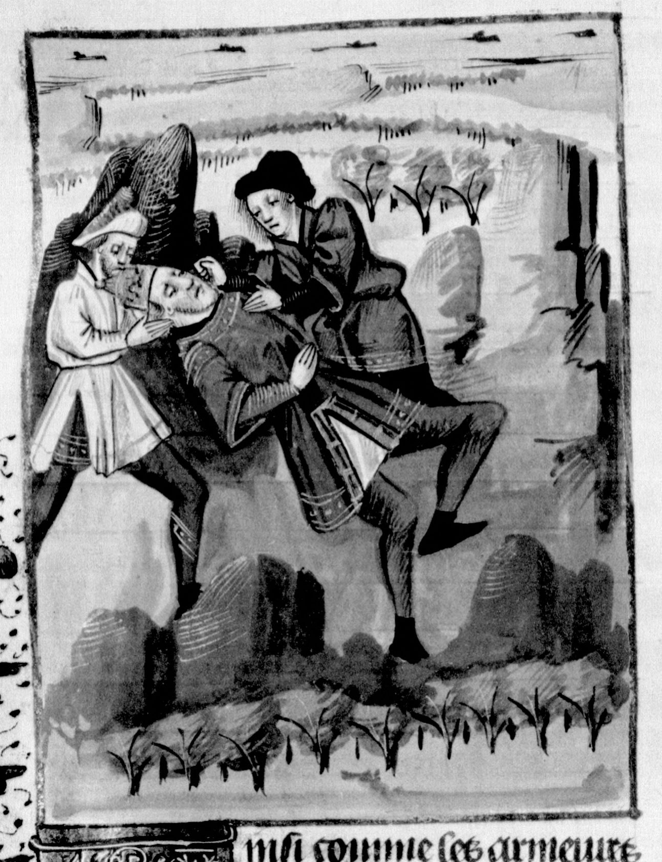 Parigi, Bibliothèque Nationale de France, Fr. 232, f. 316v. Giustiniano II viene mutilato da due aguzzini.