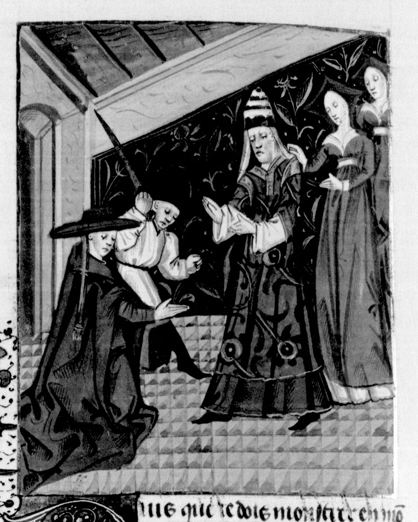 Parigi, Bibliothèque Nationale de France, Fr. 232, f. 320v. Papa Giovanni XII, circondato dalle sue amanti, fa amputare la mano ad un diacono.