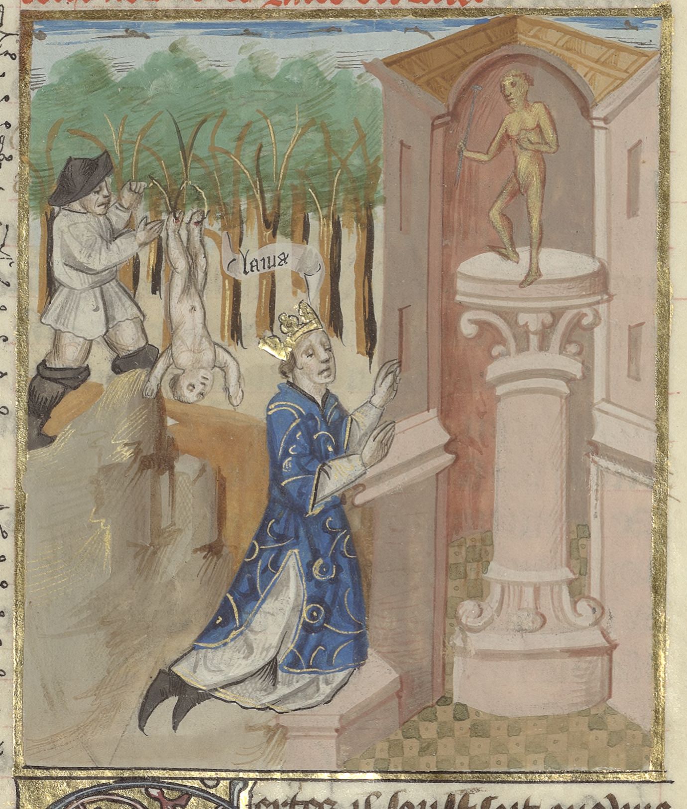Parigi, Bibliothèque de l'Arsenal, 5192, f. 13v. Laio interroga Apollo; il pastore Forbante slega il piccolo Edipo, appeso ad un albero per i piedi, per portarlo con sé.