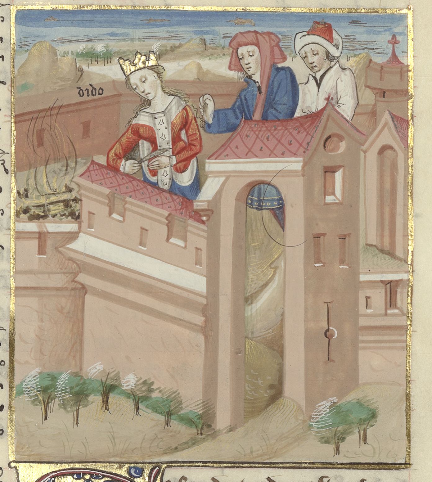 Parigi, Bibliothèque de l'Arsenal, 5192, f. 48r. La regina Didone compie il suicidio pugnalandosi sulle mura di Cartagine accanto alla pira funebre, mentre due cittadini assistono alla scena.