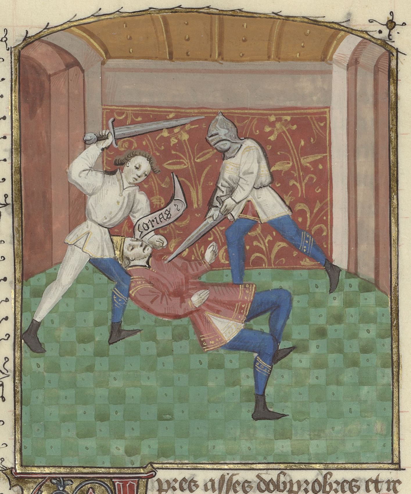 Parigi, Bibliothèque de l'Arsenal, 5192, f. 55v. Amasia viene assassinato da due uomini.