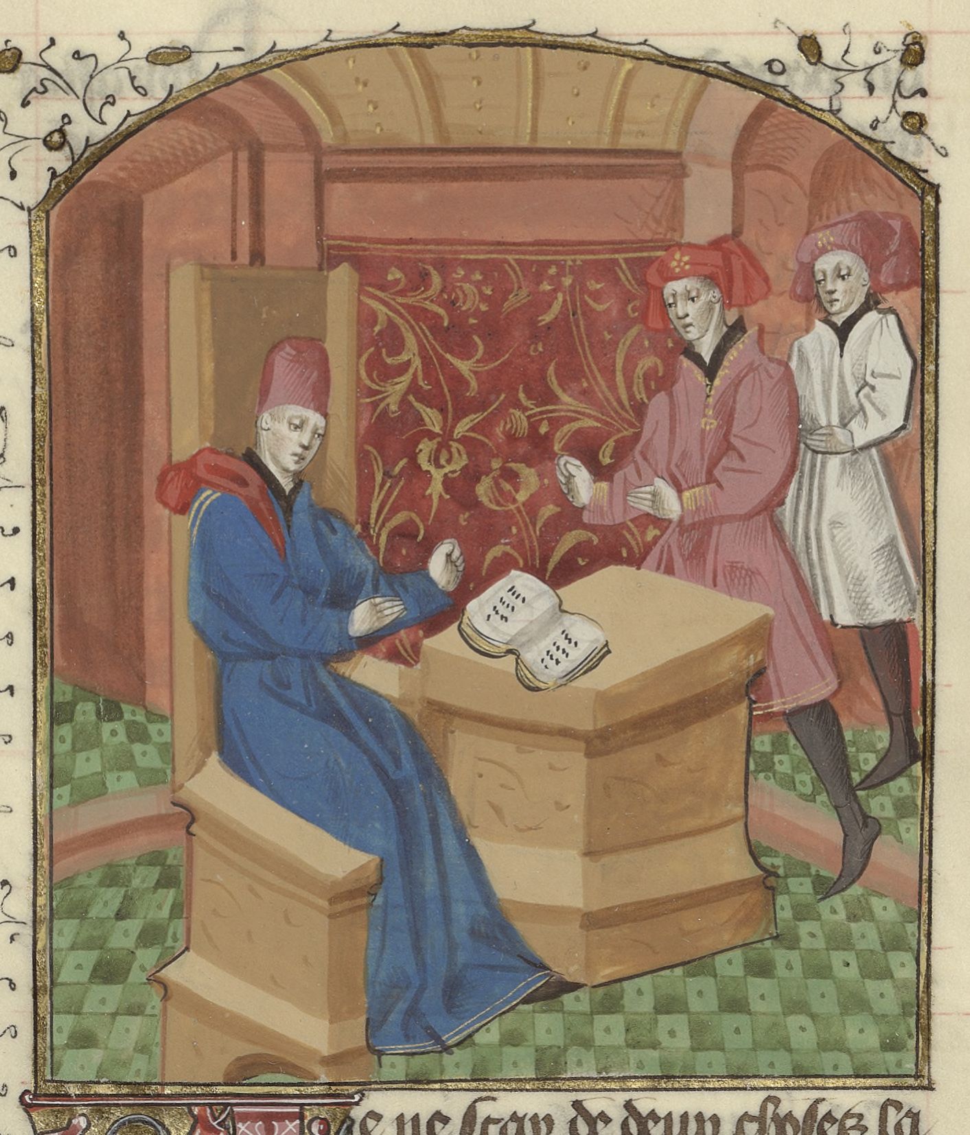 Parigi, Bibliothèque de l'Arsenal, 5192, f. 62v. Giovanni Boccaccio riceve nel suo studio due uomini colpiti dalla sfortuna.