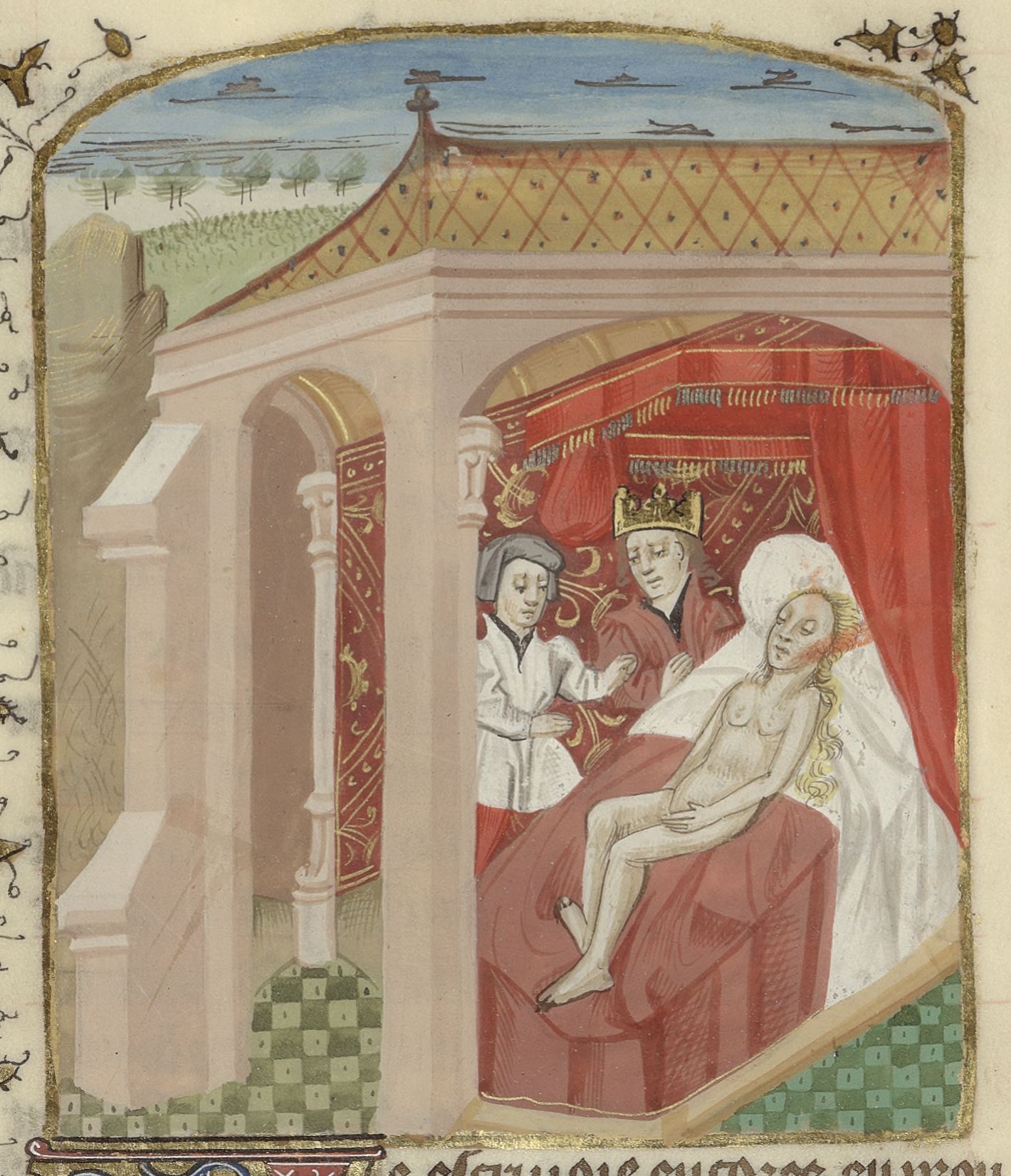 Parigi, Bibliothèque de l'Arsenal, 5192, f. 64v. Re Candaule mostra a Gige la bellezza della moglie addormentata.