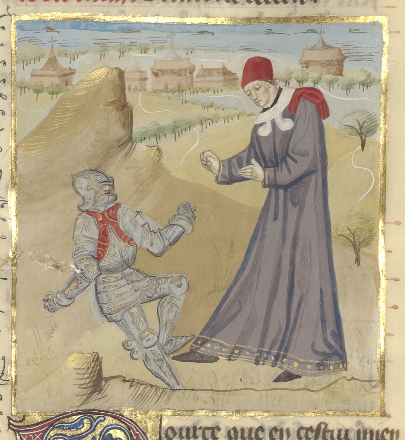 Parigi, Bibliothèque de l'Arsenal, 5192, f. 102r. Giovanni Boccaccio incontra un soldato.