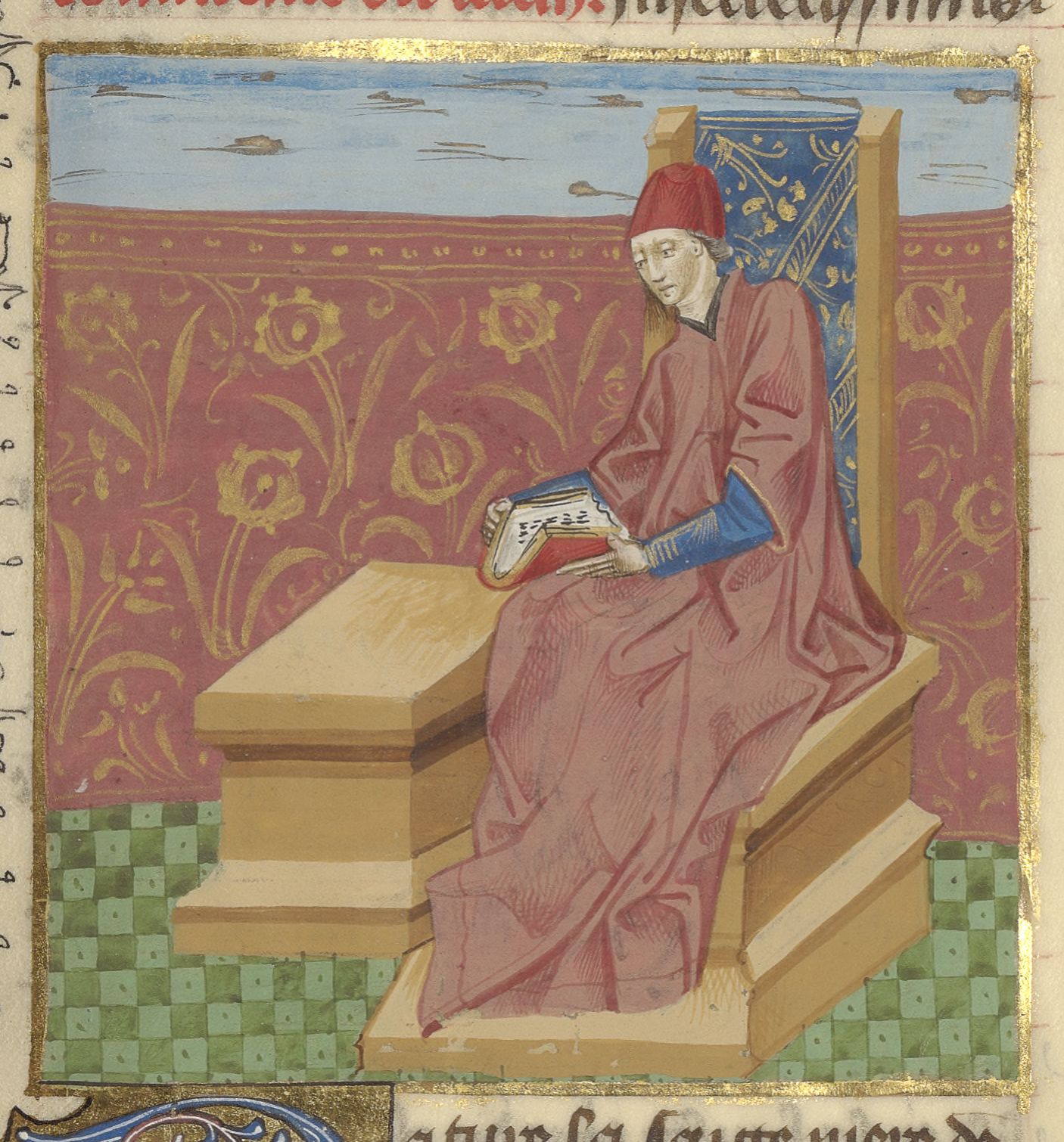 Parigi, Bibliothèque de l'Arsenal, 5192, f. 107r. Giovanni Boccaccio siede con un libro tra le mani.