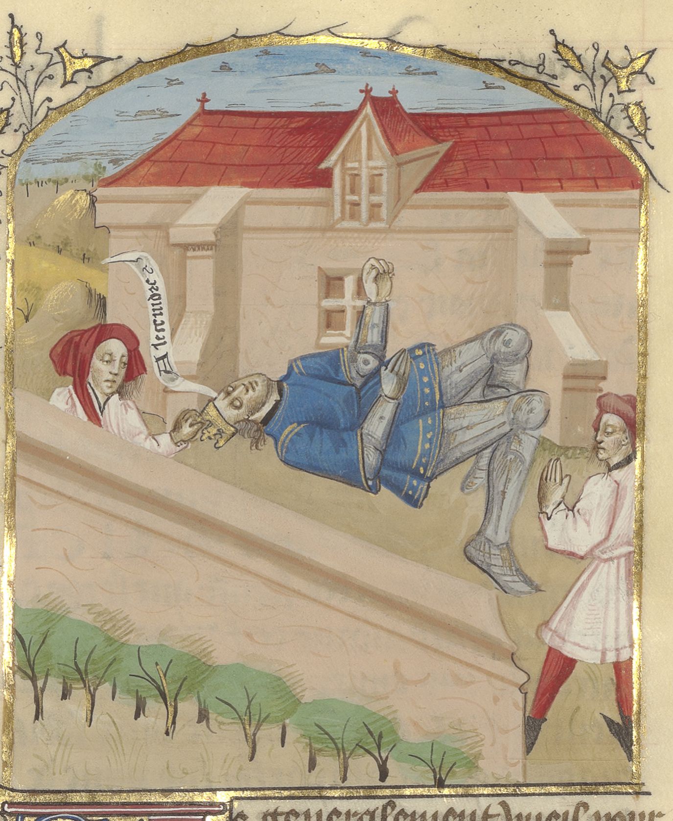Parigi, Bibliothèque de l'Arsenal, 5192, f. 109r. Due uomini davanti al corpo senza vita di Alessandro I, figlio di Aminta.