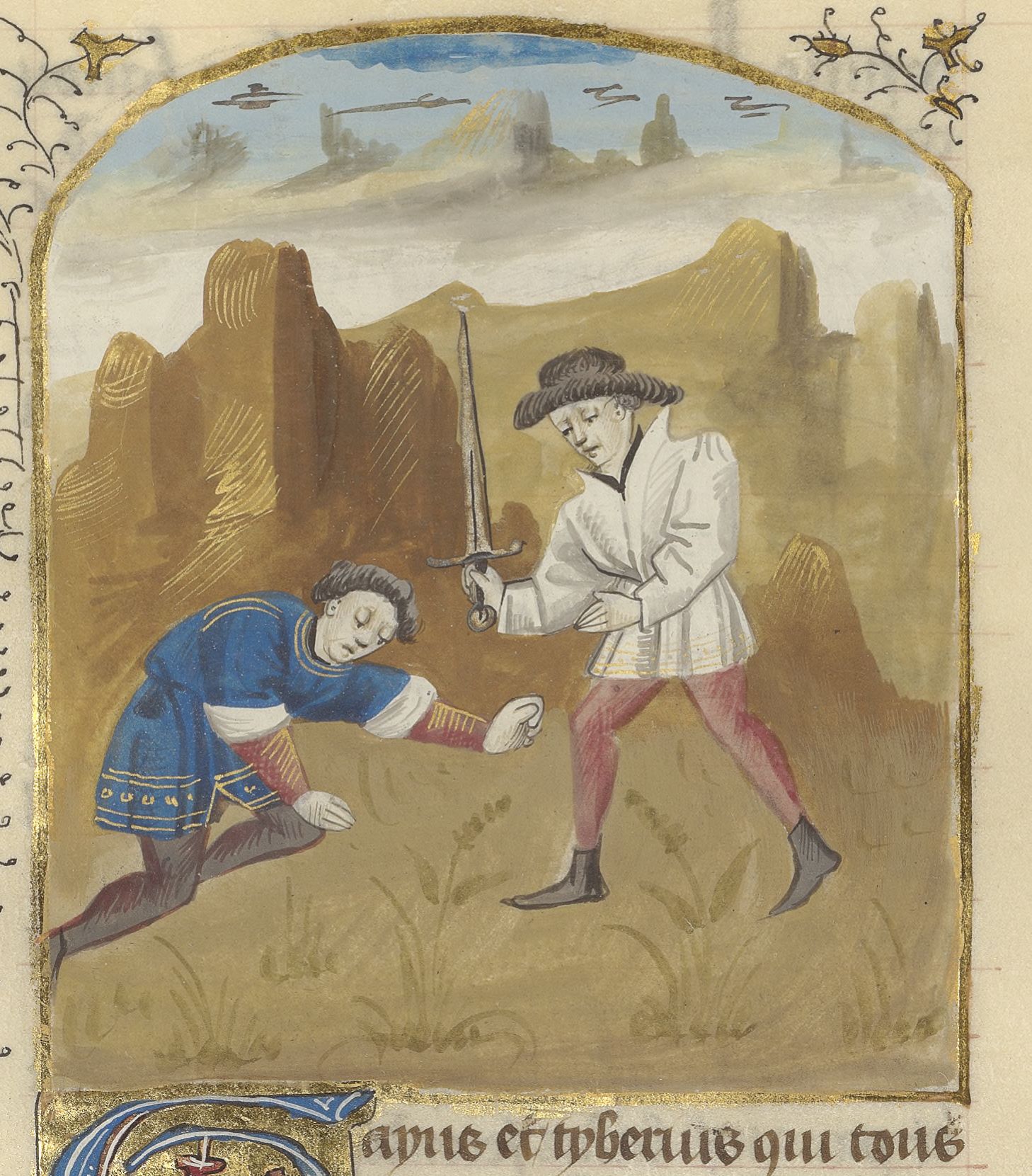 Parigi, Bibliothèque de l'Arsenal, 5192, f. 179v. Caio Sempronio Gracco si fa uccidere dal suo schiavo Filocrate.