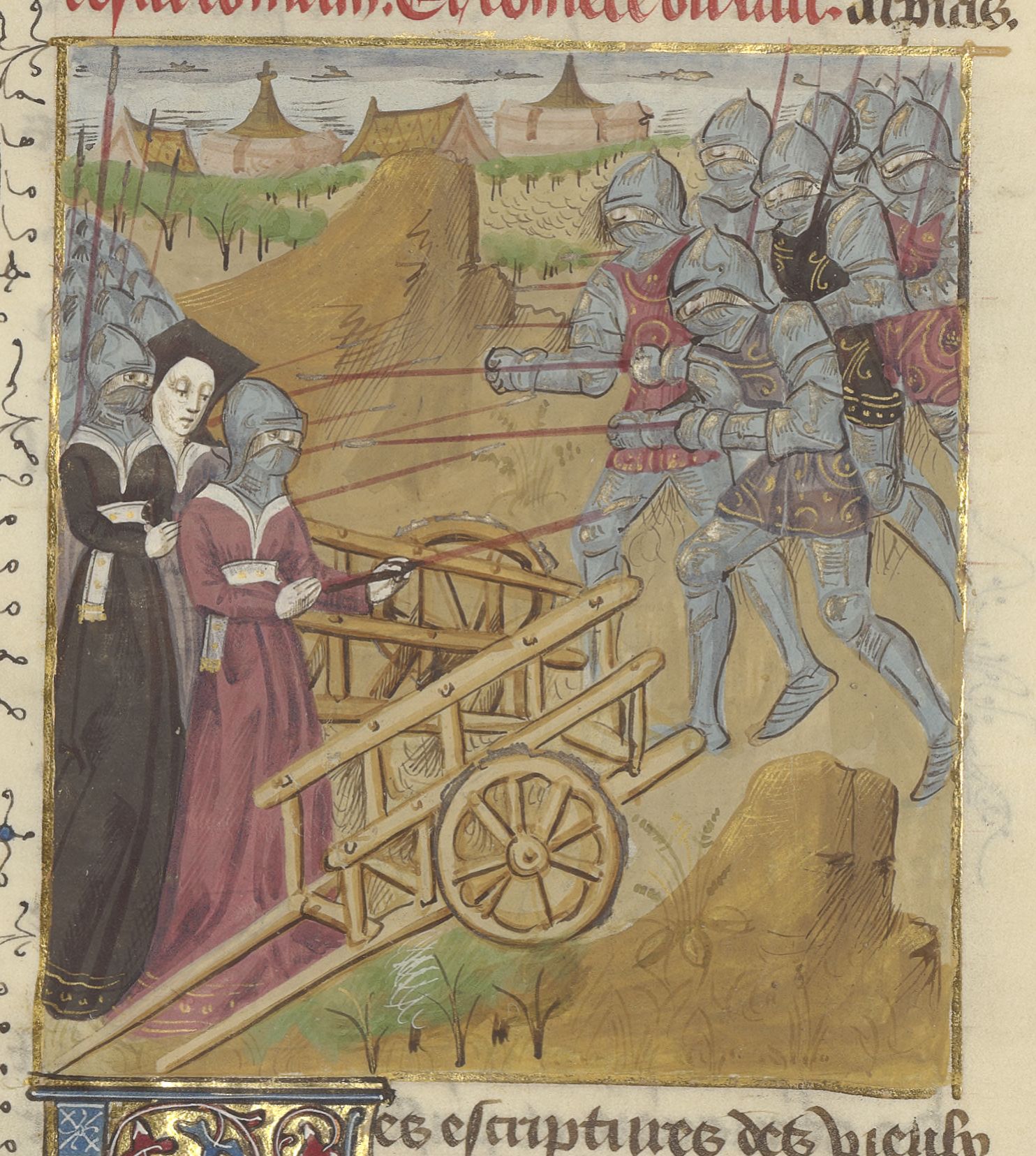 Parigi, Bibliothèque de l'Arsenal, 5192, f. 194r. Le mogli dei Cimbri in armatura affrontano l'esercito romano.