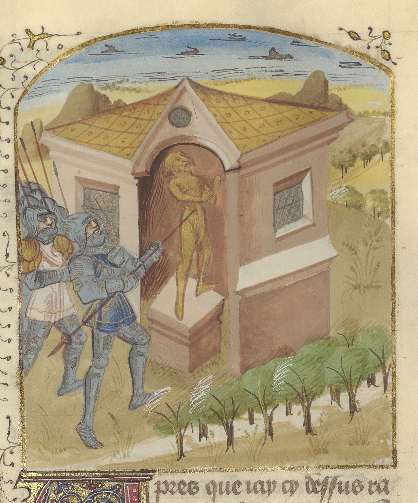 Parigi, Bibliothèque de l'Arsenal, 5192, f. 206v. Flavio Fimbria si lascia uccidere nel tempio di Esculapio (?).