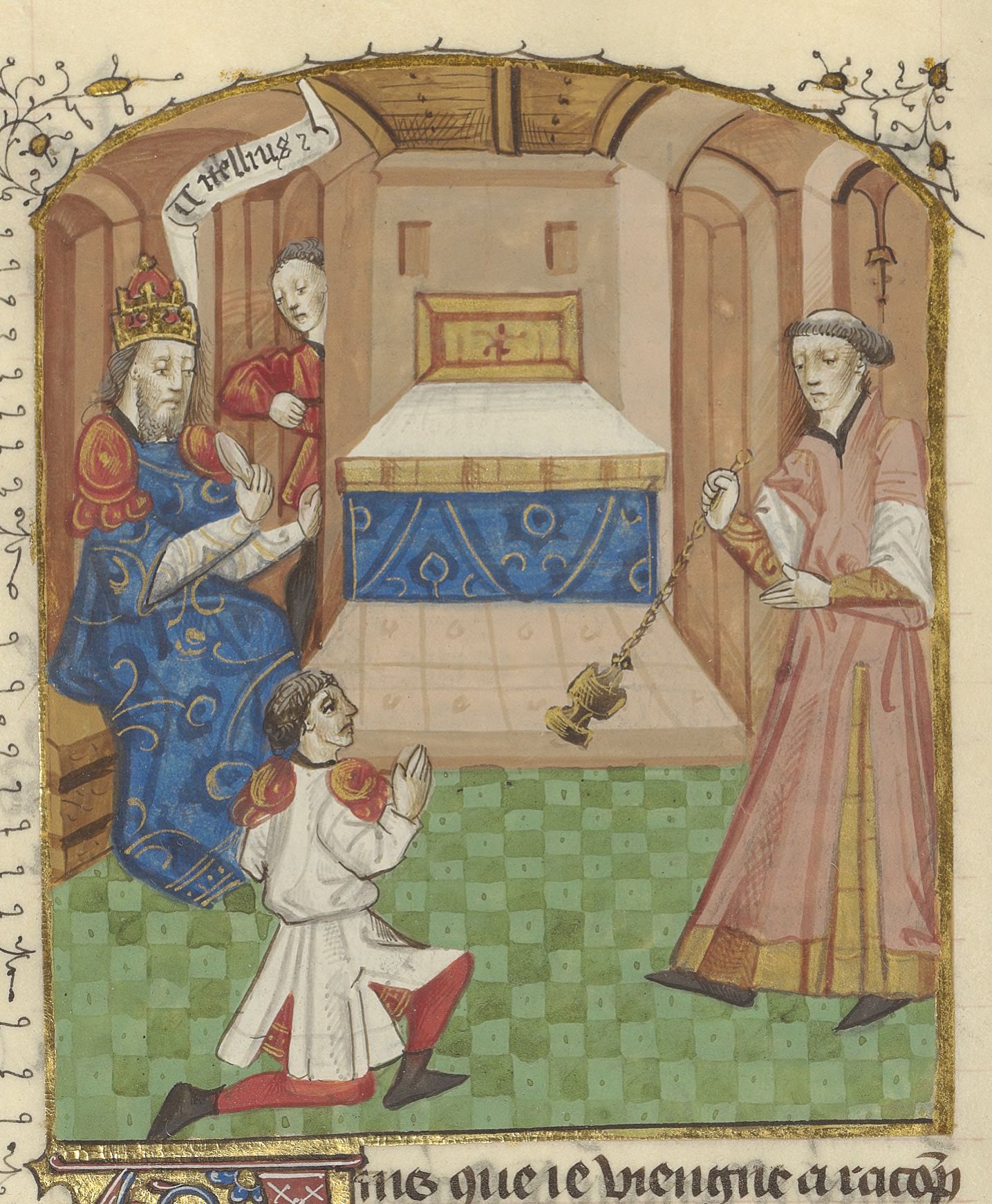 Parigi, Bibliothèque de l'Arsenal, 5192, f. 247v. L'imperatore Vitellio mangia un pezzo di carne mentre due sacerdoti offrono dell'incenso ad un altare.