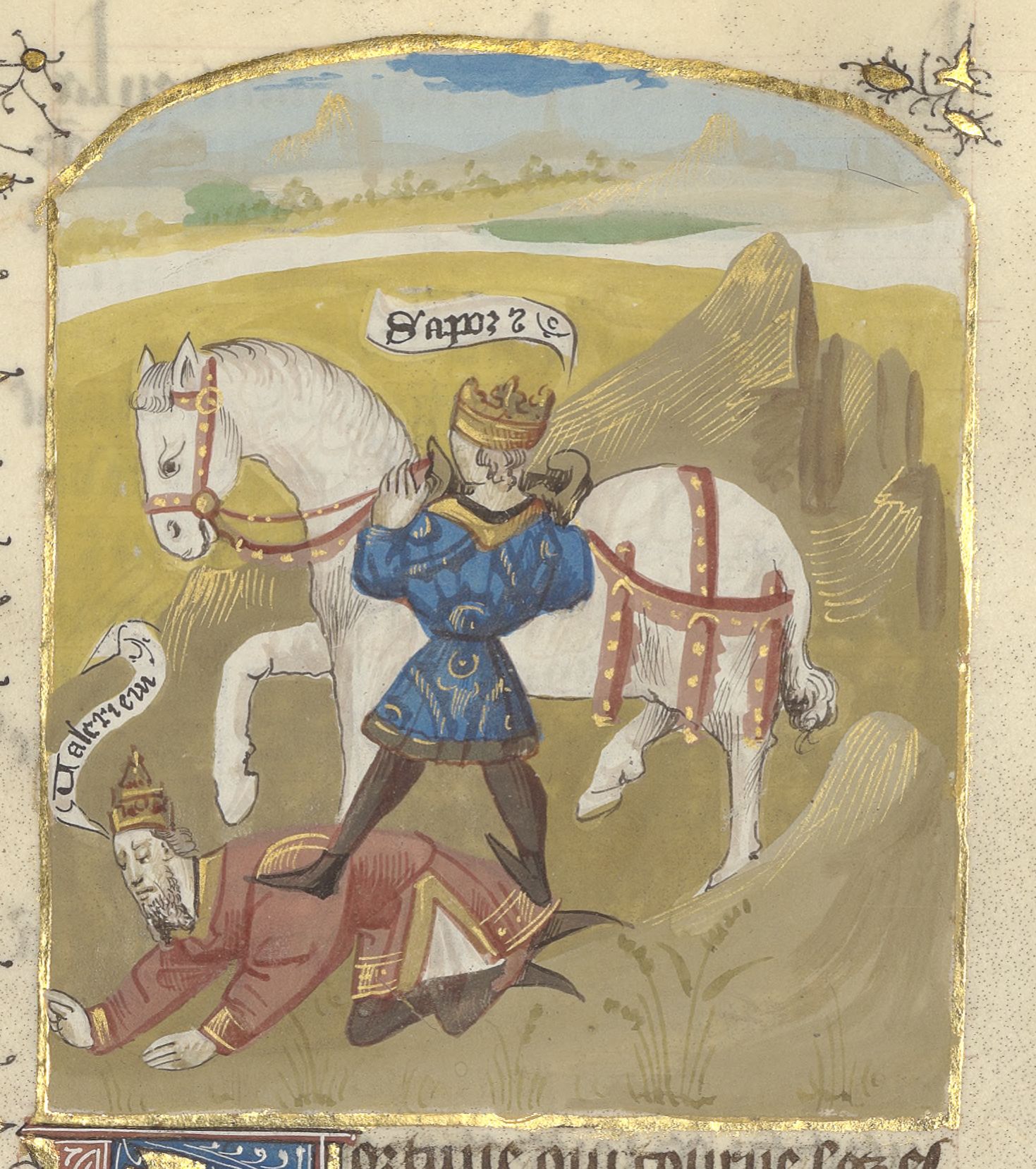 Miniatore francese (1425-1450), Sapore monta a cavallo usando la schiena di Valeriano come predellino