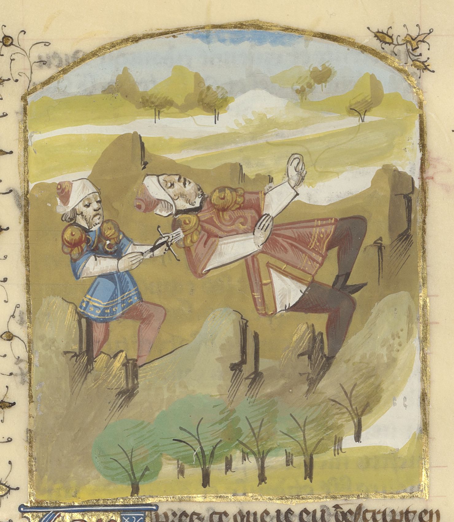 Parigi, Bibliothèque de l'Arsenal, 5192, f. 268v. Un sovrano viene colpito alle spalle da un uomo.
