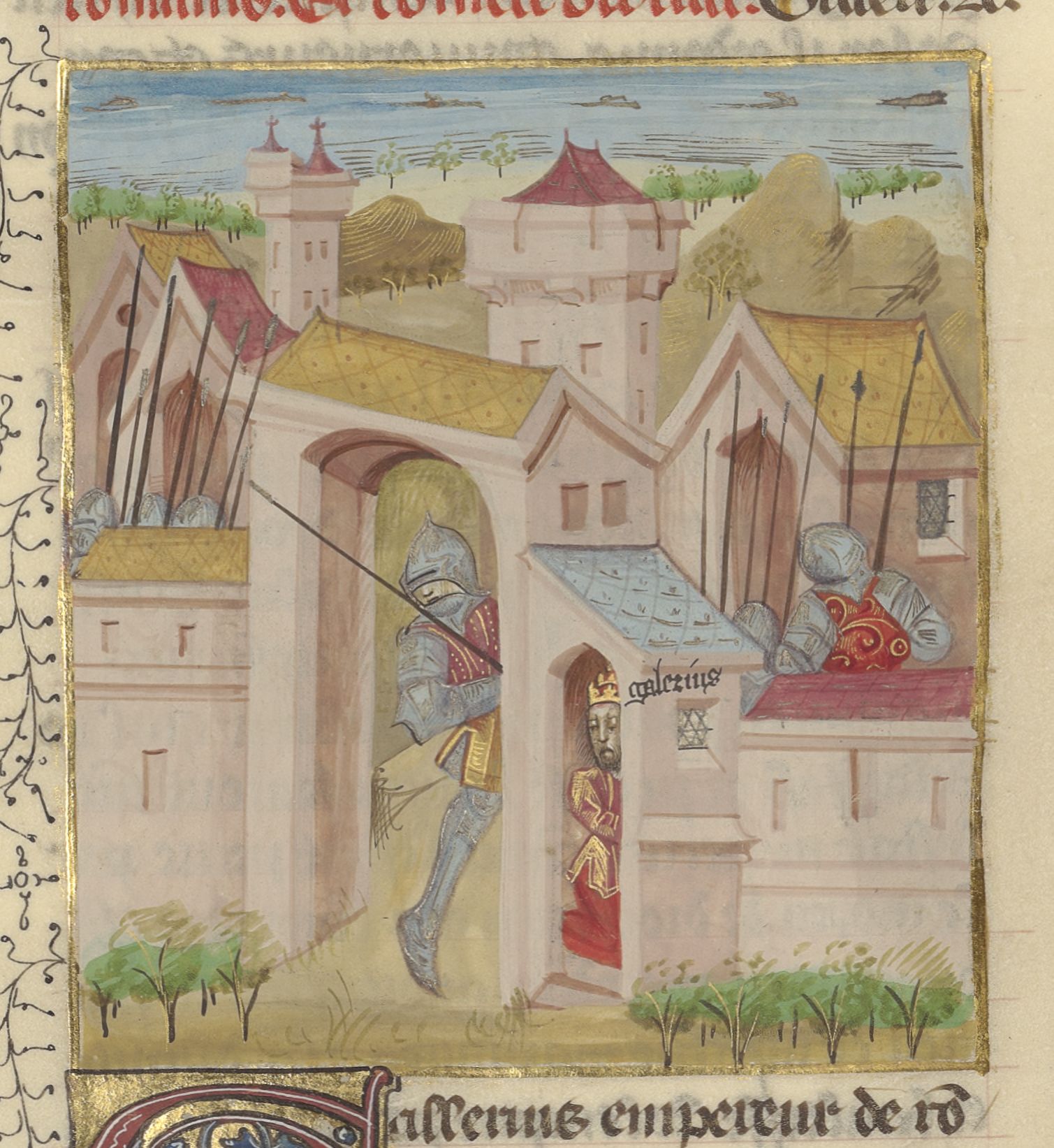 Parigi, Bibliothèque de l'Arsenal, 5192, f. 276v. I soldati di Galerio perseguitano i Cristiani; Galerio è inginocchiato in penitenza all'interno di una abitazione.