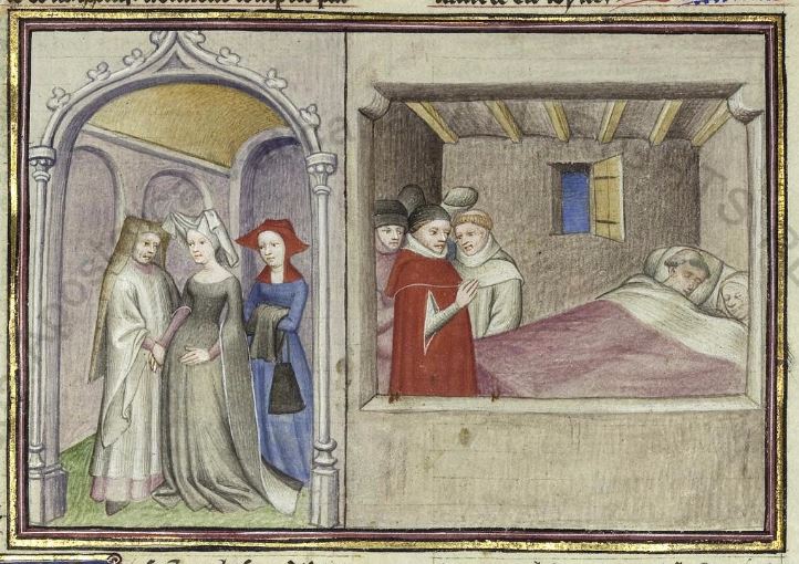 Città del Vaticano, Biblioteca Apostolica Vaticana, Pal. lat. 1989, f. 236r. Il copista del manoscritto, datato 15 giugno 1414, è Laurent de Premierfait. Monna Piccarda visita il parroco di Fiesole per invitarlo nella sua casa; il parroco viene sorpreso dal vescovo e dai fratelli di Piccarda mentre giace a letto con la serva.