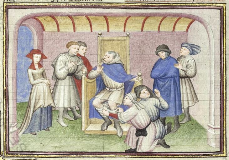 Città del Vaticano, Biblioteca Apostolica Vaticana, Pal. lat. 1989, f. 238r. Il copista del manoscritto, datato 15 giugno 1414, è Laurent de Premierfait. Ribi e Matteuzzo tirano giù le braghe al giudice Nicola mentre questi dirime una contesa.