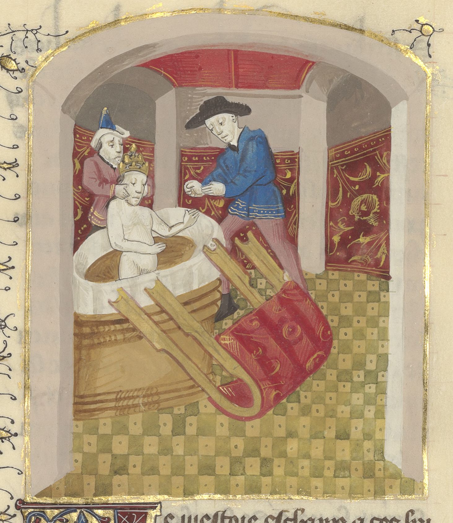 Parigi, Bibliothèque de l'Arsenal, 5192, f. 309r. Costantino III viene assassinato nella vasca da bagno da due uomini.