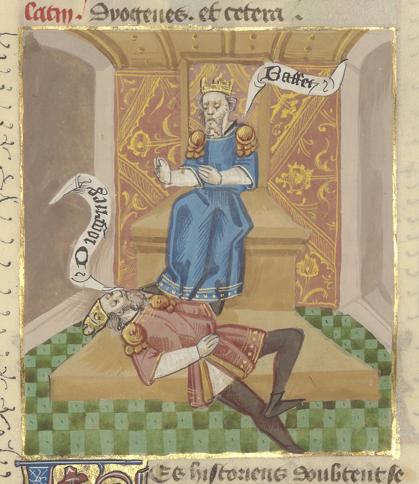 Parigi, Bibliothèque de l'Arsenal, 5192, f. 319r. Belzet siede sul trono utilizzando Diogene come poggiapiedi.