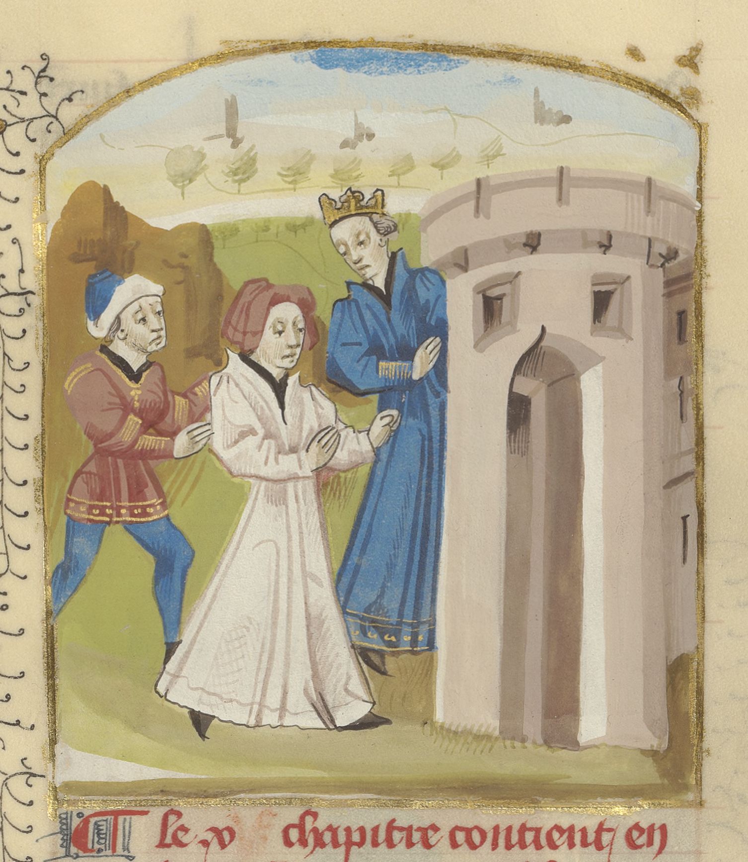 Parigi, Bibliothèque de l'Arsenal, 5192, f. 319v. Roberto re di Normandia viene condotto in prigione per ordine del fratello Enrico I.