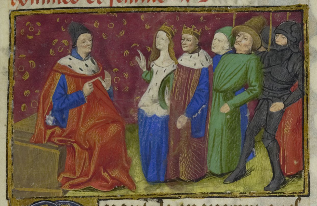 Parigi, Bibliothèque Nationale de France, Fr. 597, f. 1r. Un gruppo di uomini e donne, appartenenti a tutte le classi sociali, si presentano dinanzi all'autore Giovanni Boccaccio.