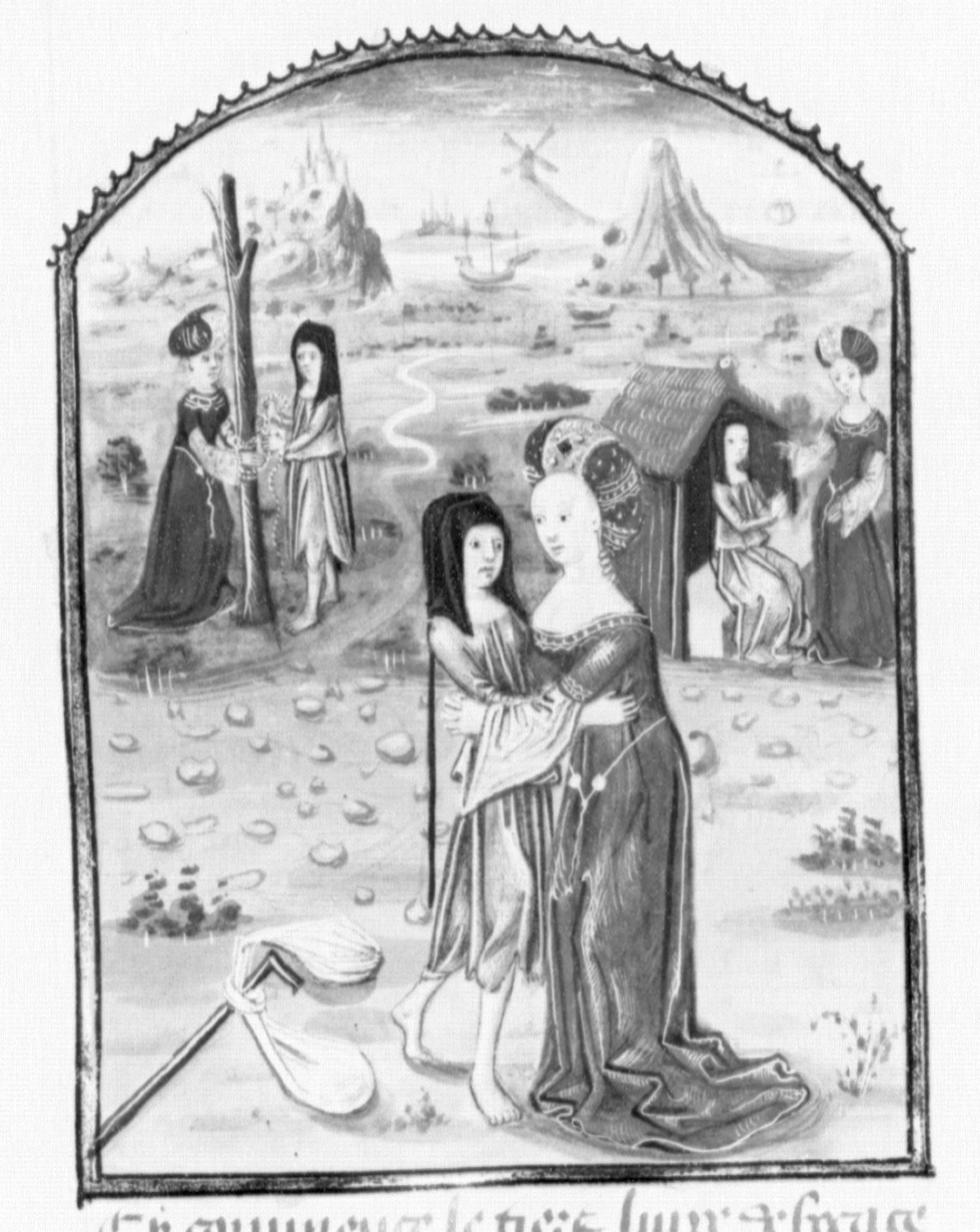 Parigi, Bibliothèque Nationale de France, Fr. 132, f. 42v. La Povertà, raffigurata come una vecchia vestita di stracci, lotta con la Fortuna, una dama in abiti eleganti; la Povertà lega la Sfortuna ad un palo; la Fortuna biasima la Povertà, seduta all'entrata della sua capanna.