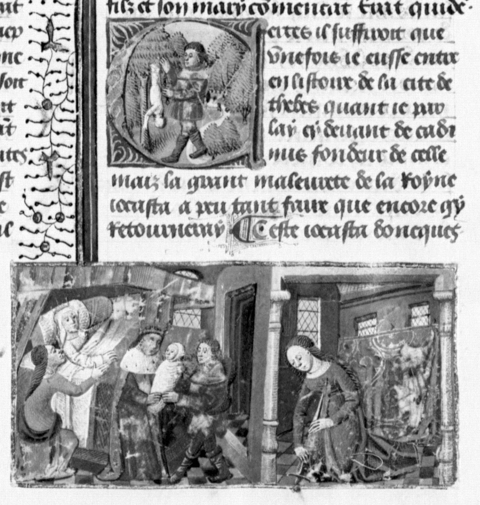 Parigi, Bibliothèque Nationale de France, Fr. 233, f. 11r. Laio consegna Edipo appena nato ad un servitore perché lo uccida; Giocasta si trafigge con una spada. All'interno dell'iniziale istoriata C(ertes), il pastore Forbante slega il piccolo Edipo, appeso ad un albero per i piedi, per portarlo con sé.