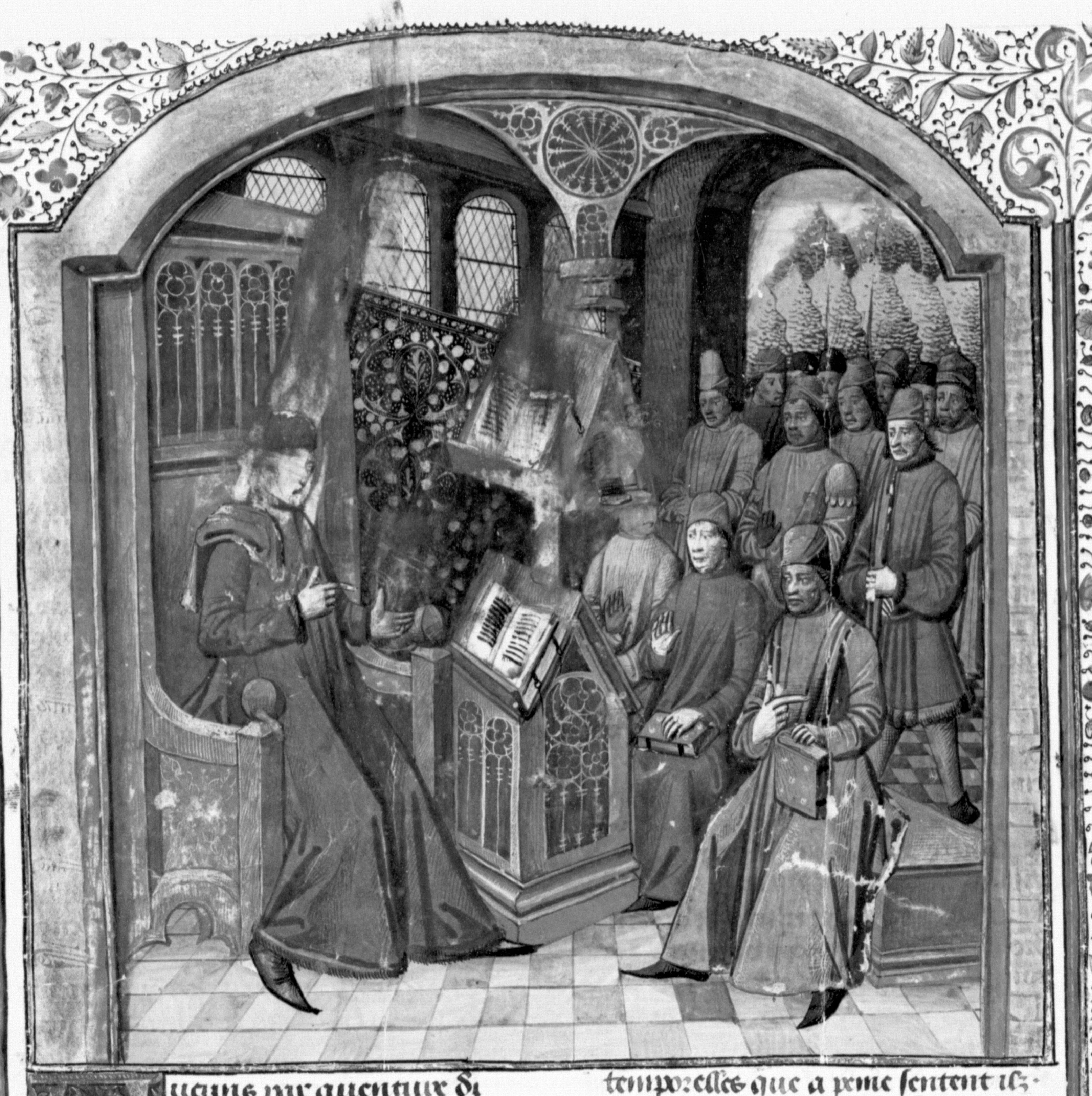 Parigi, Bibliothèque Nationale de France, Fr. 233, f. 34v. Un gruppo di uomini colpiti dalla sfortuna compare dinanzi a Giovanni Boccaccio.