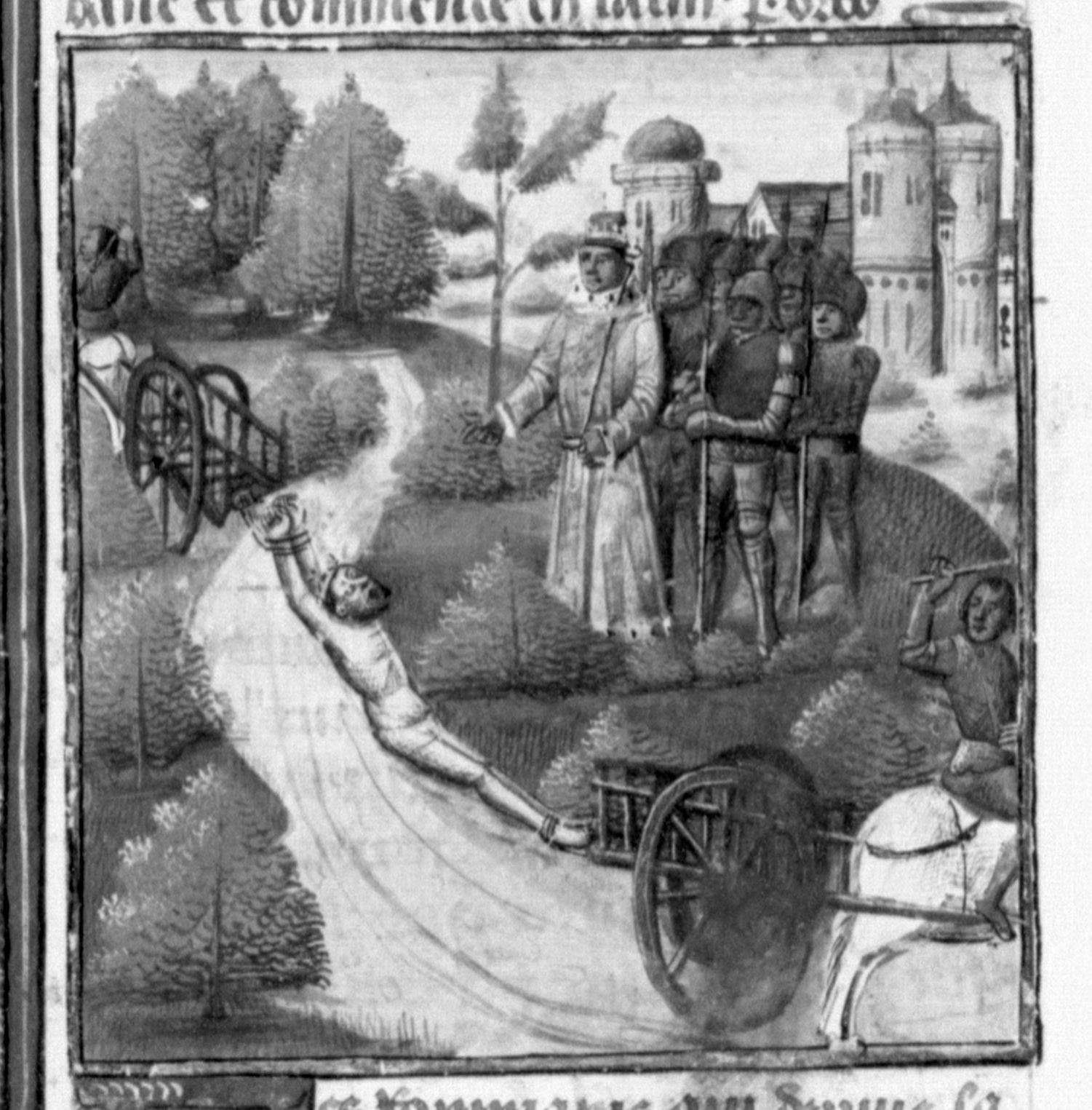 Parigi, Bibliothèque Nationale de France, Fr. 233, f. 62v. Mezio Fufezio viene legato tra due carri per essere squartato.