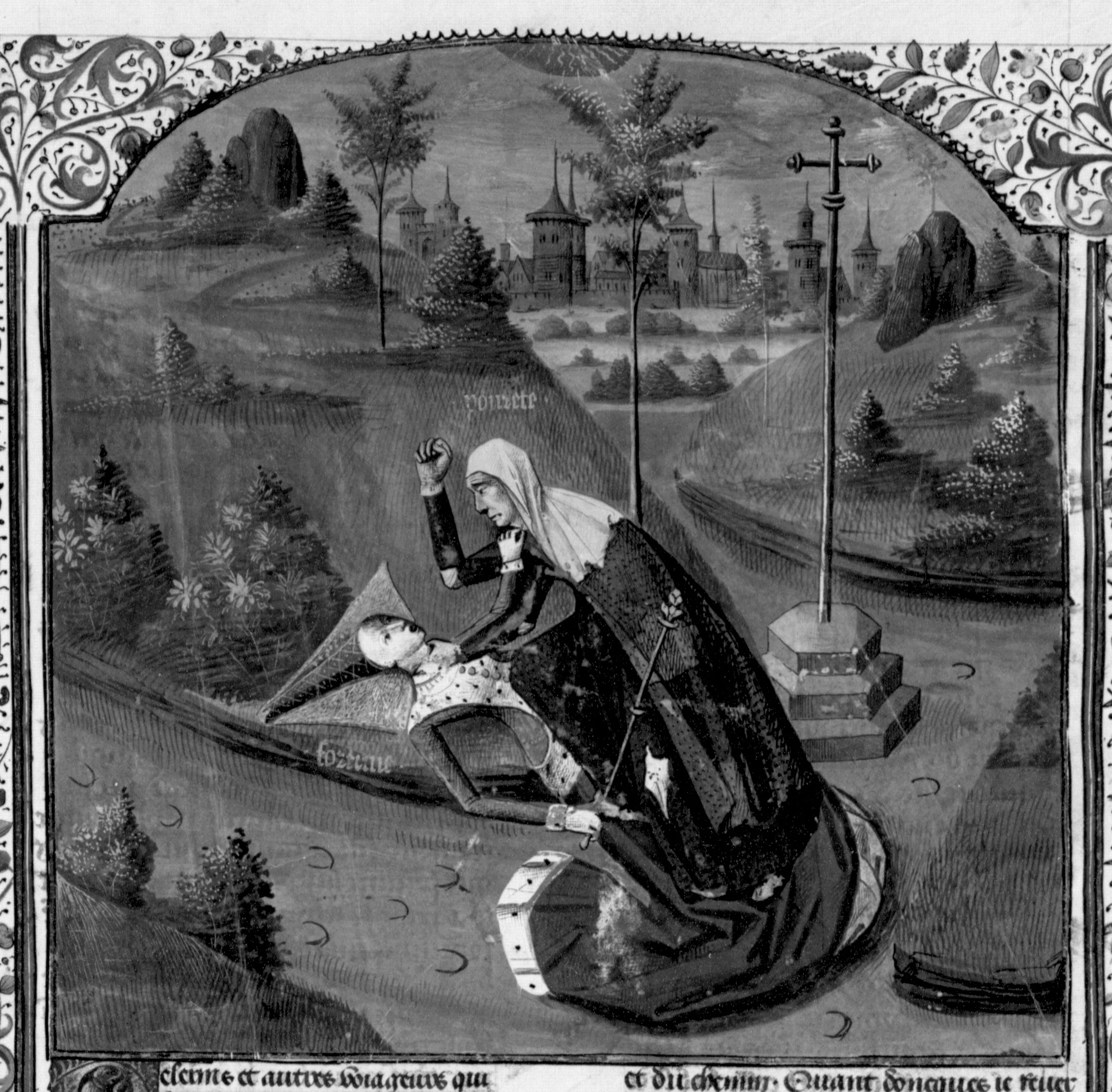 Parigi, Bibliothèque Nationale de France, Fr. 233, f. 65r. La Povertà, rappresentata come una vecchia vestita di stracci, lotta ad un crocevia con la Fortuna, una dama in abiti eleganti.
