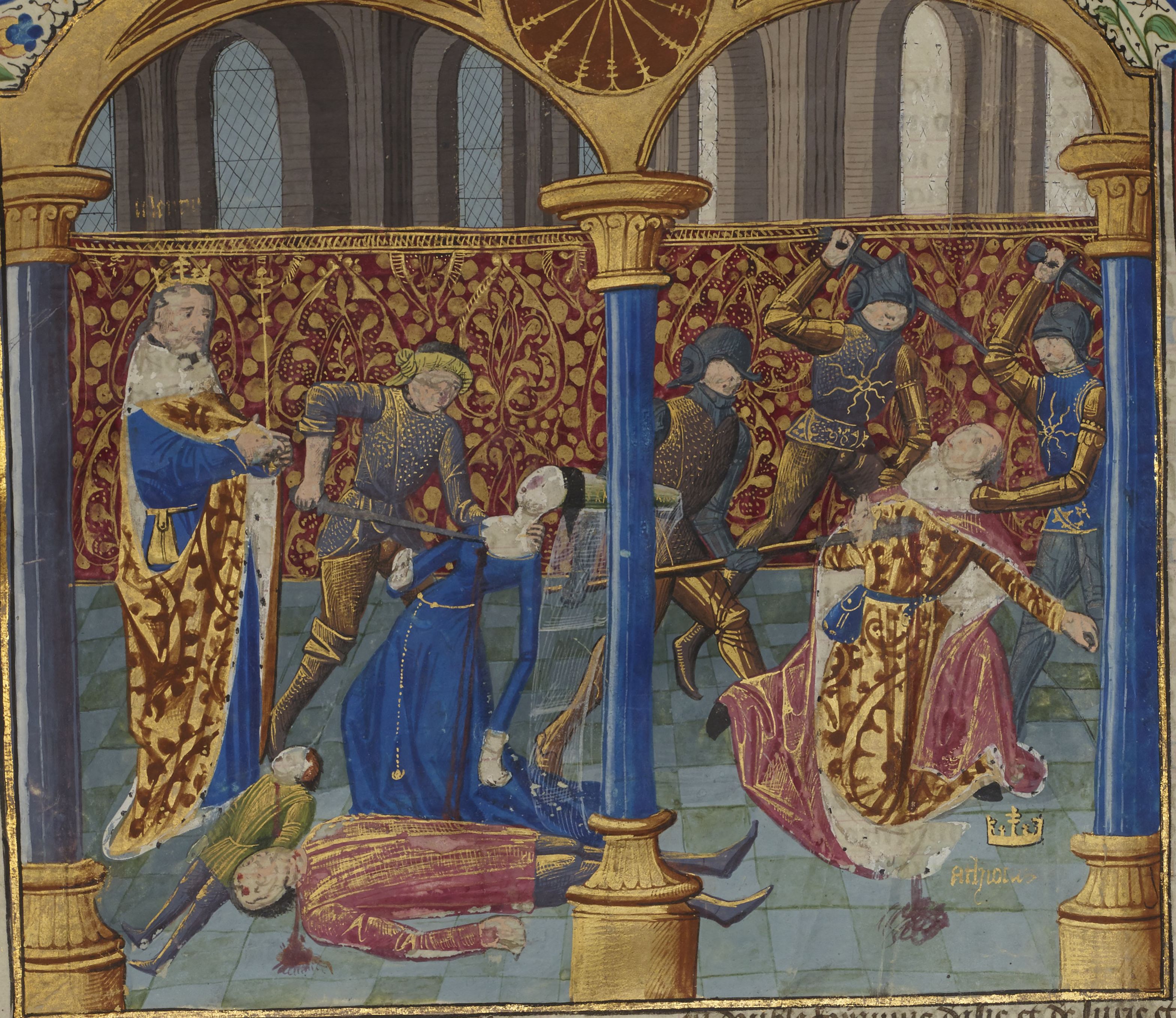 Parigi, Bibliothèque Nationale de France, Fr. 234, f. 36v. La morte di Beronice, moglie di Antioco II, e di uno dei suoi figli; Antioco viene assassinato (errore).