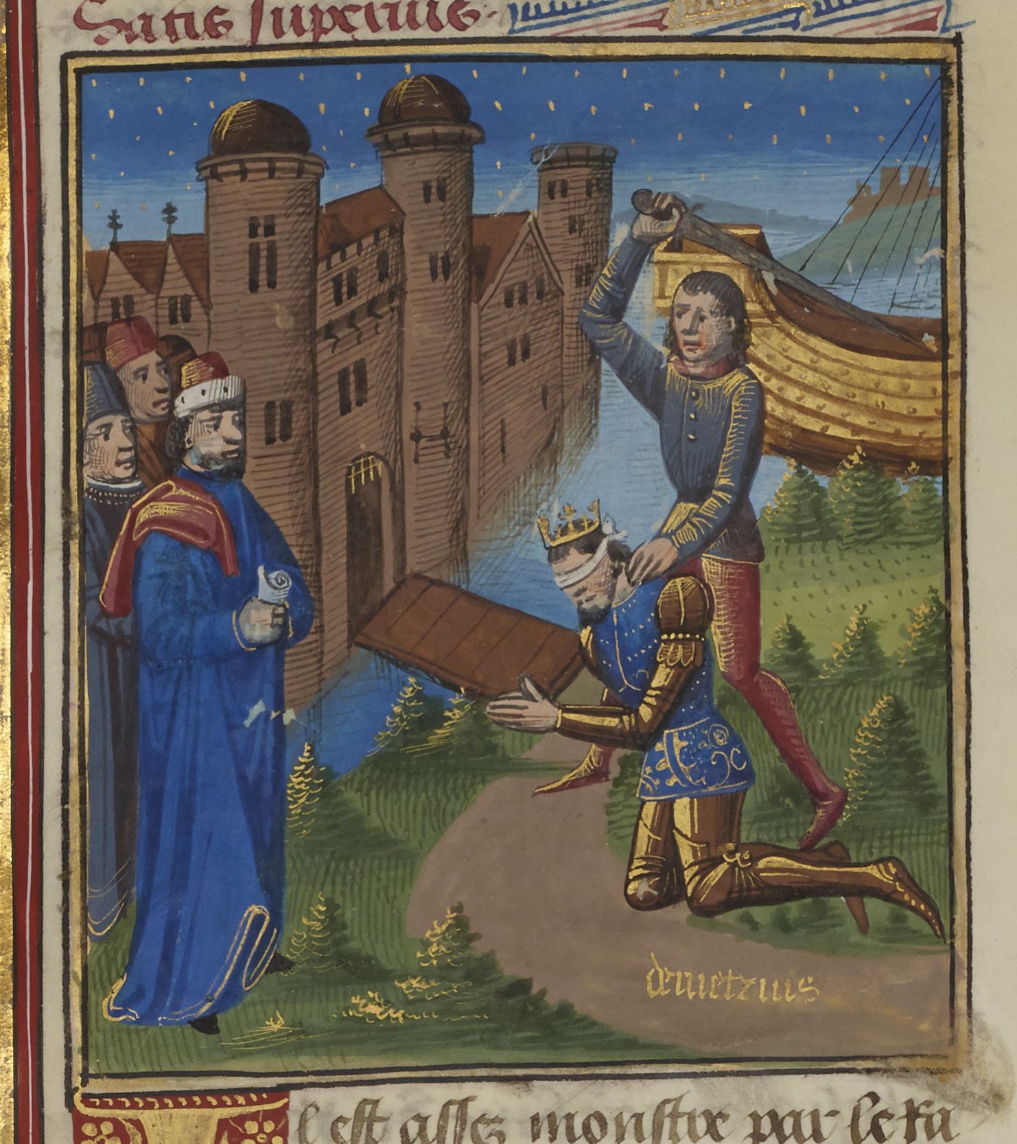 Parigi, Bibliothèque Nationale de France, Fr. 234, f. 62v. Demetrio II viene decapitato appena sbarcato sulle coste di Tiro.