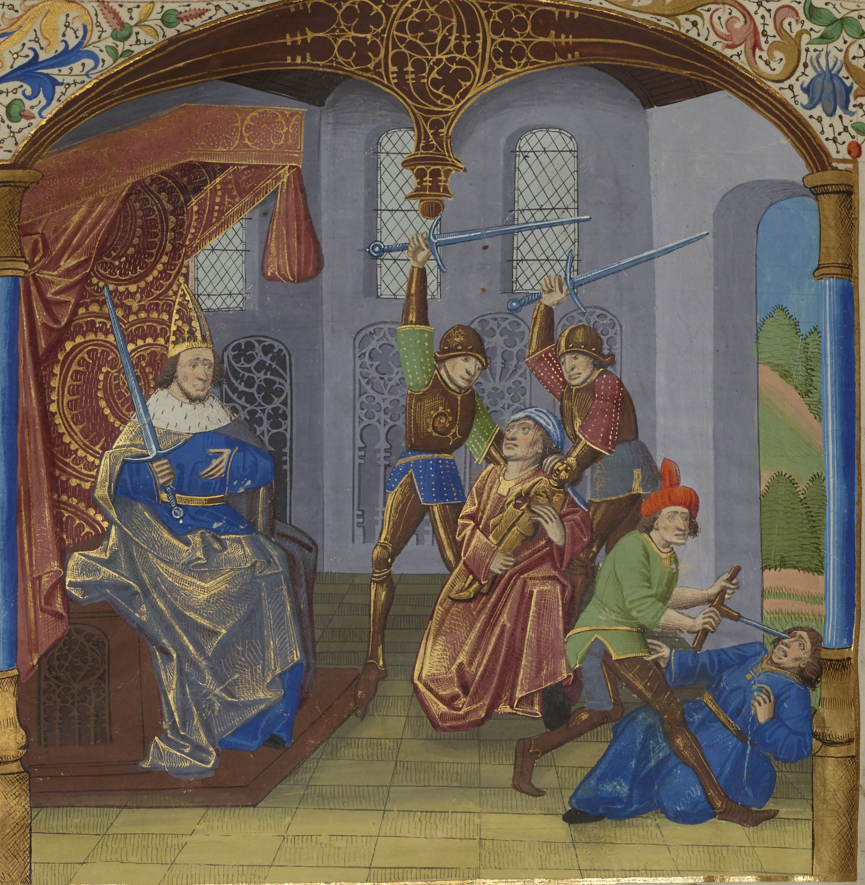 Parigi, Bibliothèque Nationale de France, Fr. 234, f. 107v. Ottaviano ordina l'uccisione di Marco Antonio Minore, il quale cerca riparo dietro una statua di Giulio Cesare; Quinto Gallio viene accecato.