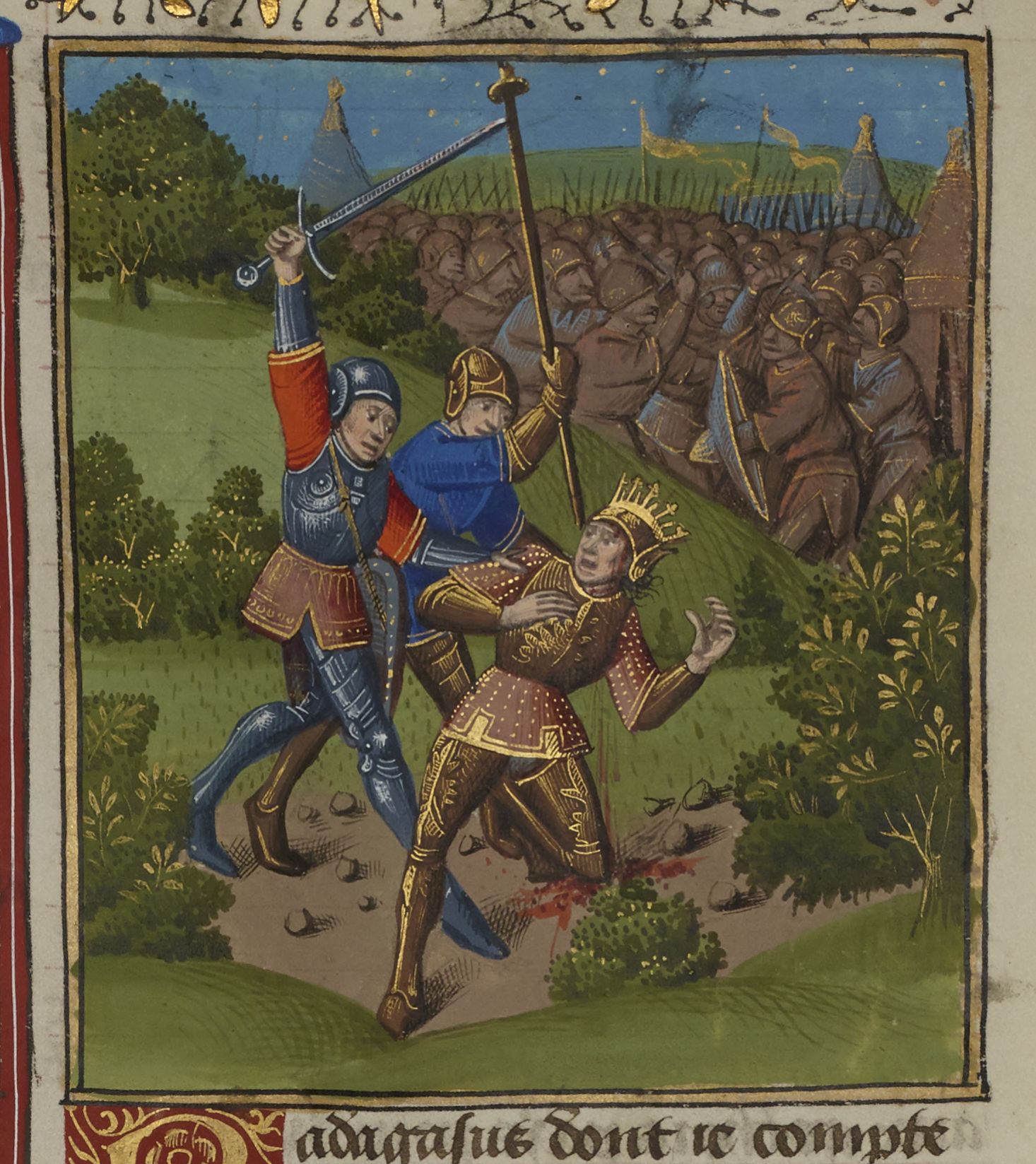 Parigi, Bibliothèque Nationale de France, Fr. 234, f. 158r. Radagaiso viene ucciso da due soldati; gli eserciti di Radagaiso e Stilicone si scontrano.