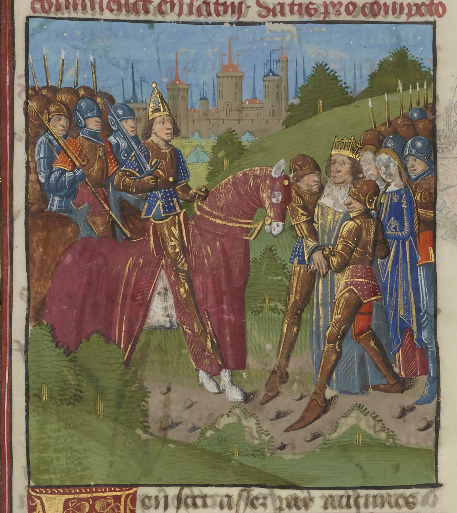 Parigi, Bibliothèque Nationale de France, Fr. 234, f. 189r. Enrico VI, giunto a cavallo a capo delle sue truppe, incontra i prigionieri Guglielmo di Sicilia e le sue sorelle.