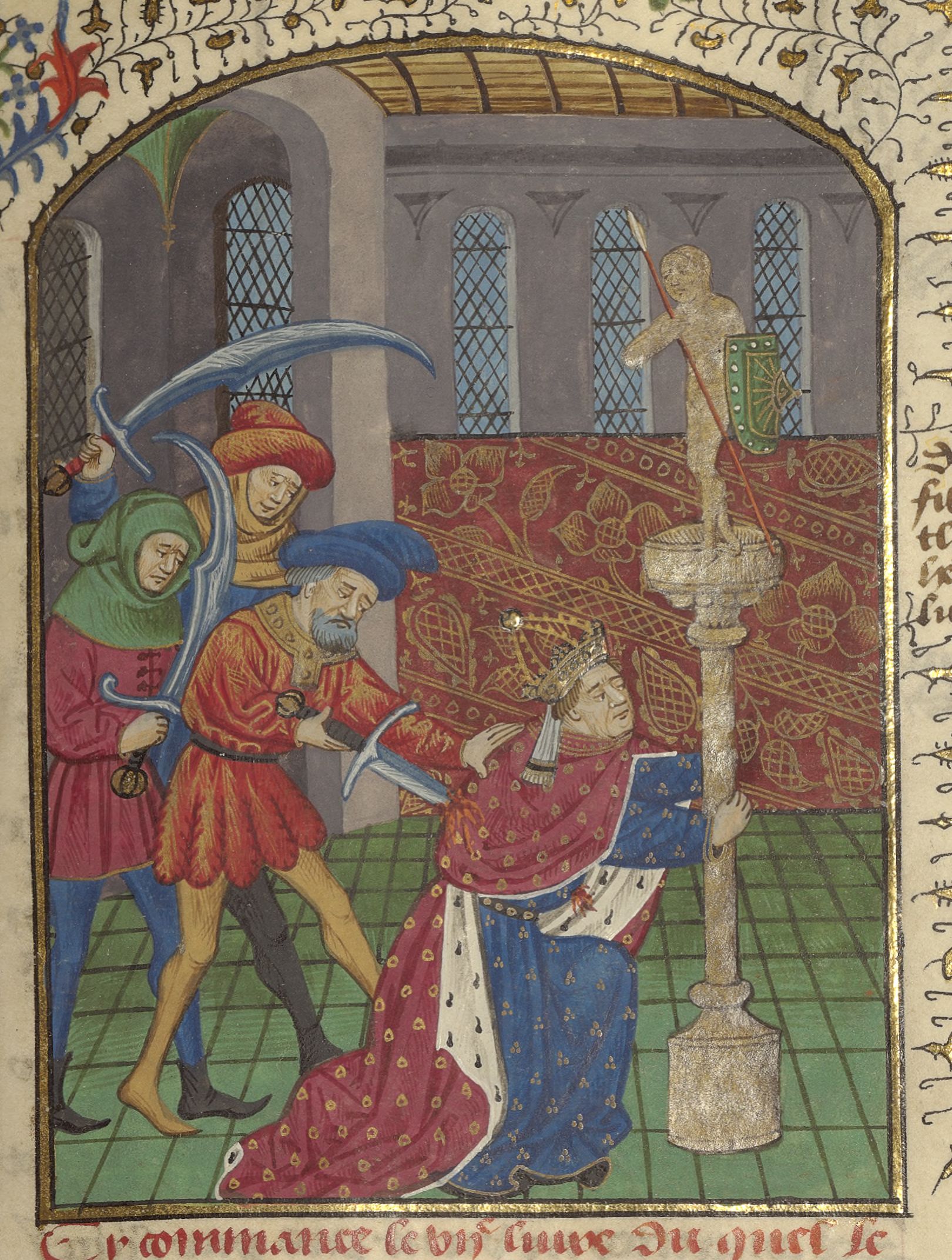 Parigi, Bibliothèque de l'Arsenal, 5191, f. 171r. Marco Antonio Minore viene assassinato mentre tenta di ripararsi dietro una statua di Giulio Cesare.