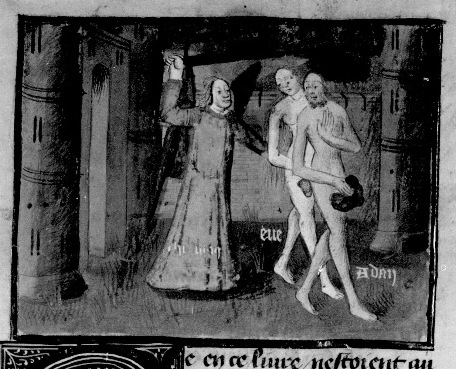 Parigi, Bibliothèque Nationale de France, Fr. 230, f. 5v. Il copista del manoscritto è P. Droulin. Adamo ed Eva vengono cacciati dal Paradiso Terrestre da un angelo con la spada sguainata.