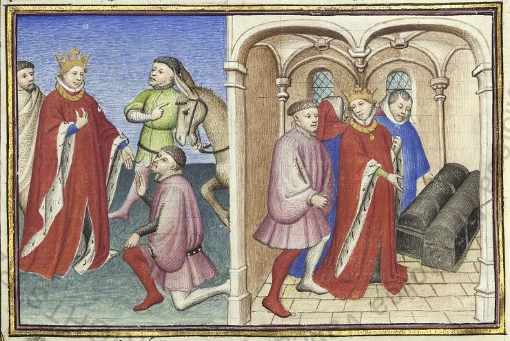 Maestro della Cité des Dames (1414-1419), Ruggieri si congeda da re Alfonso; il re invita Ruggieri a scegliere tra due forzieri
