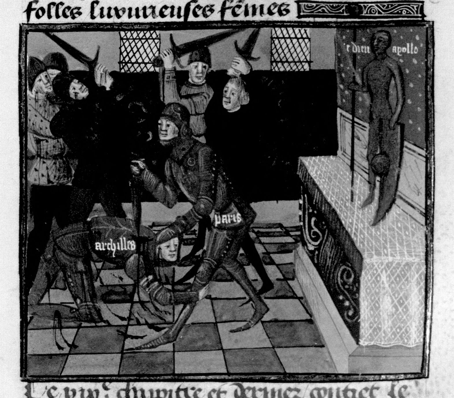Parigi, Bibliothèque Nationale de France, Fr. 230, f. 29r. Il copista del manoscritto è P. Droulin. Oreste uccide Neottolemo (Pirro), figlio di Achille, nel tempio di Apollo.