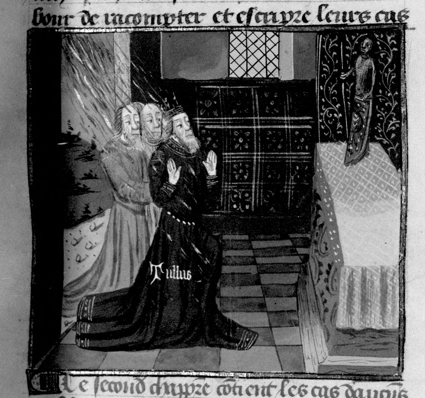Parigi, Bibliothèque Nationale de France, Fr. 230, f. 63r. Il copista del manoscritto è P. Droulin. Tullo Ostilio e i suoi uomini vengono colpiti dal fulmine divino mentre pregano dinanzi a un altare.