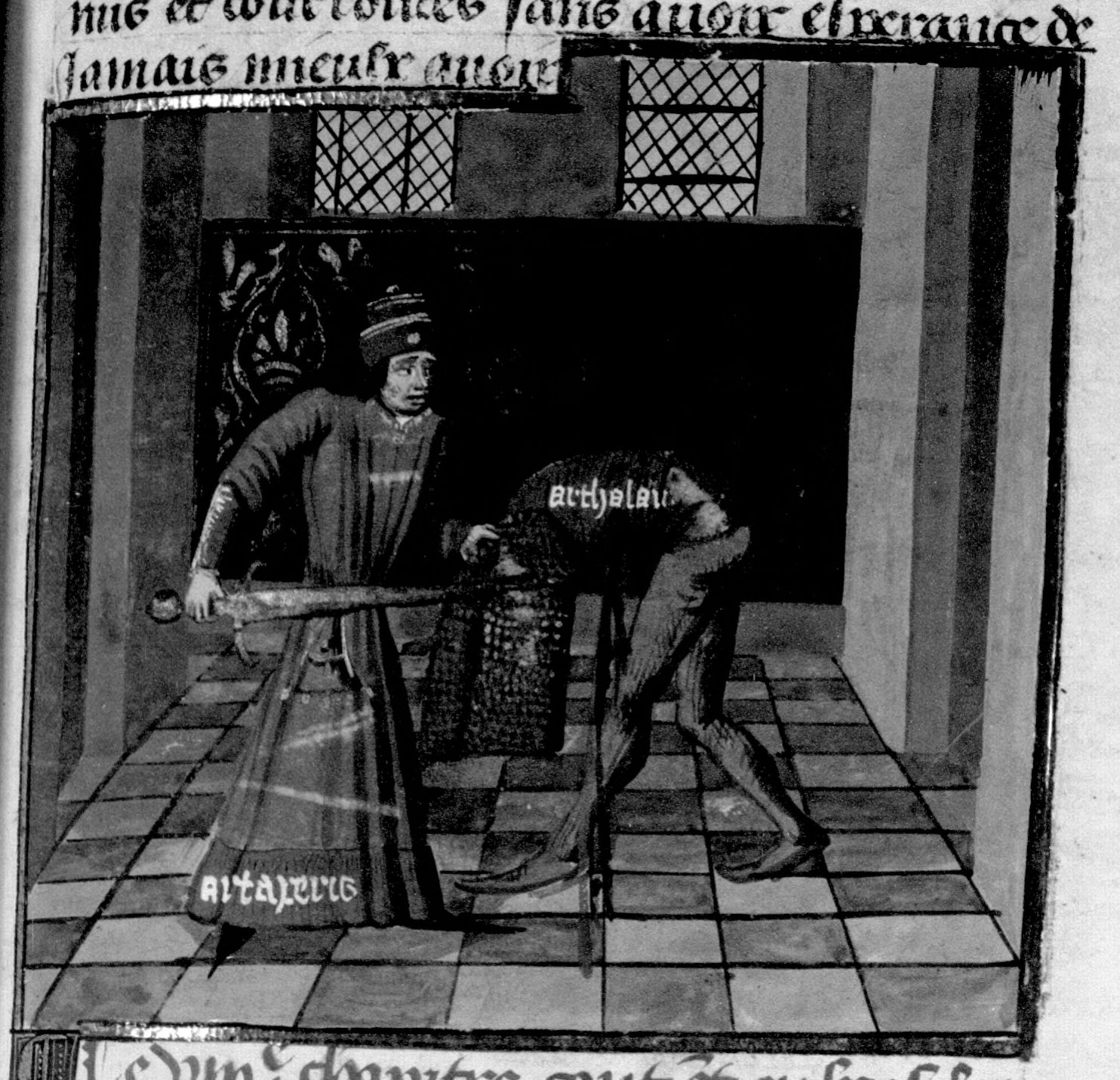 Parigi, Bibliothèque Nationale de France, Fr. 230, f. 78r. Il copista del manoscritto è P. Droulin. Artabano viene ucciso a tradimento da Artaserse.
